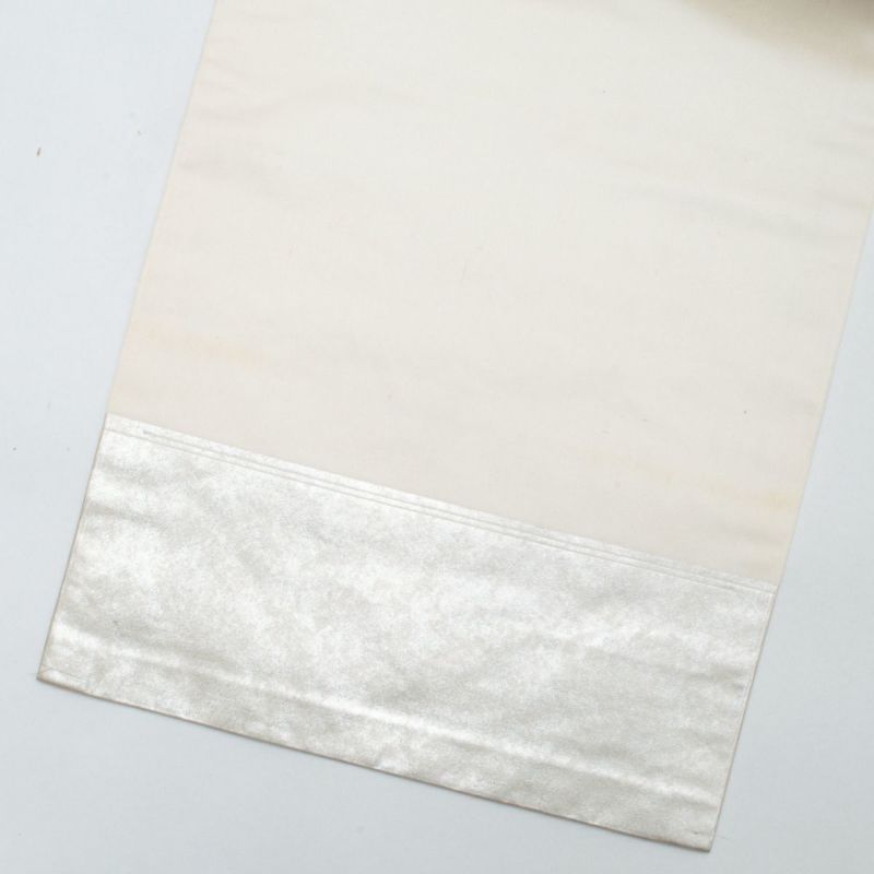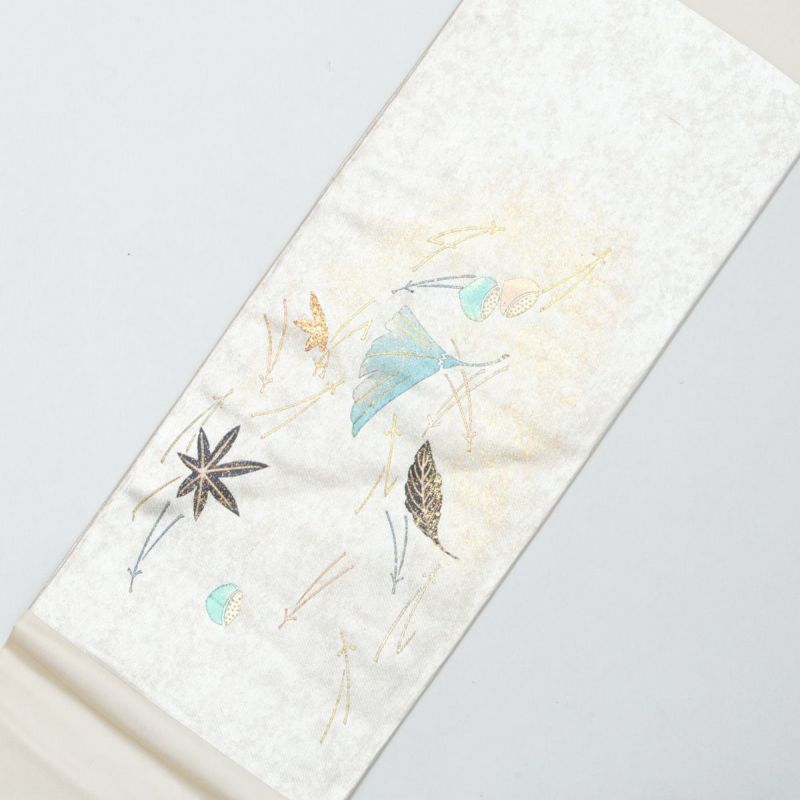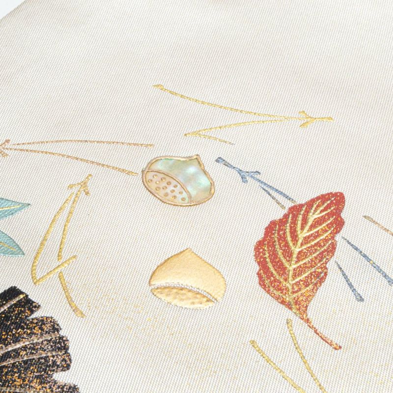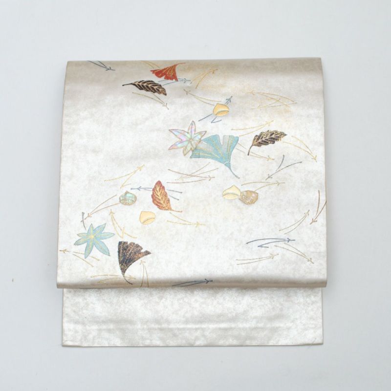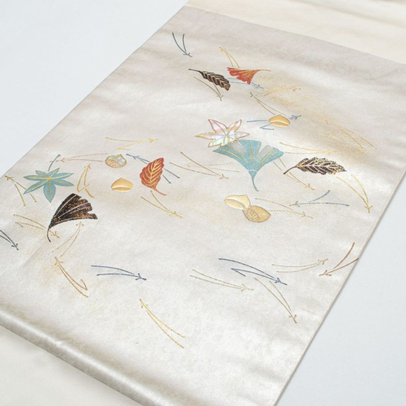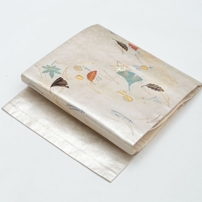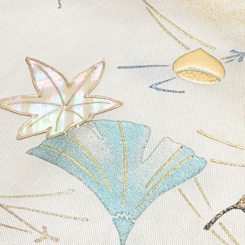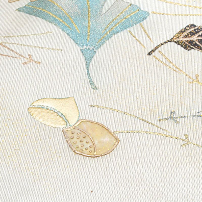 上品なオフホワイト地に、螺鈿の艶めきと金彩・引き箔が美しく調和する名古屋帯です。