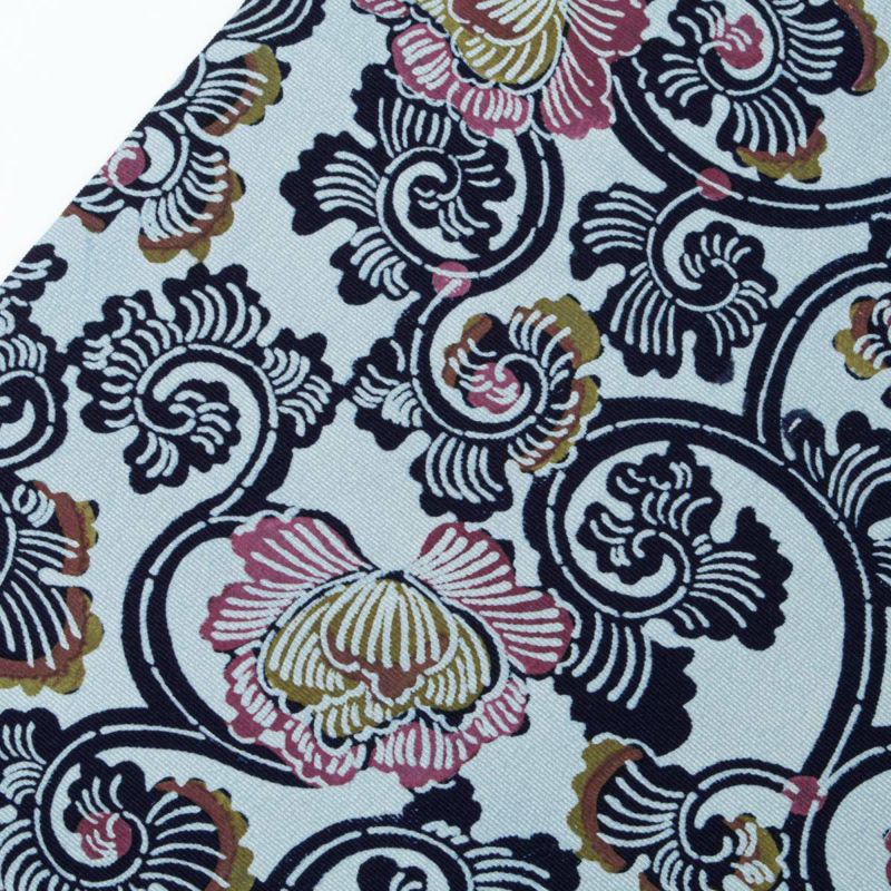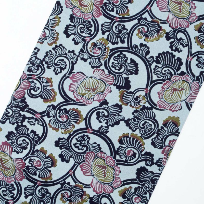 濃紺地に型友禅で表現された牡丹唐草が、力強くも華やかな印象を与える名古屋帯です。