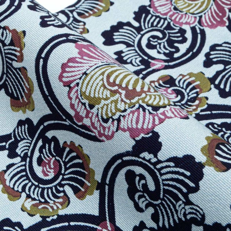 白を基調とした牡丹の花びらに、紅色や鶯茶の差し色が映え、文様に立体感とリズムが生まれています。