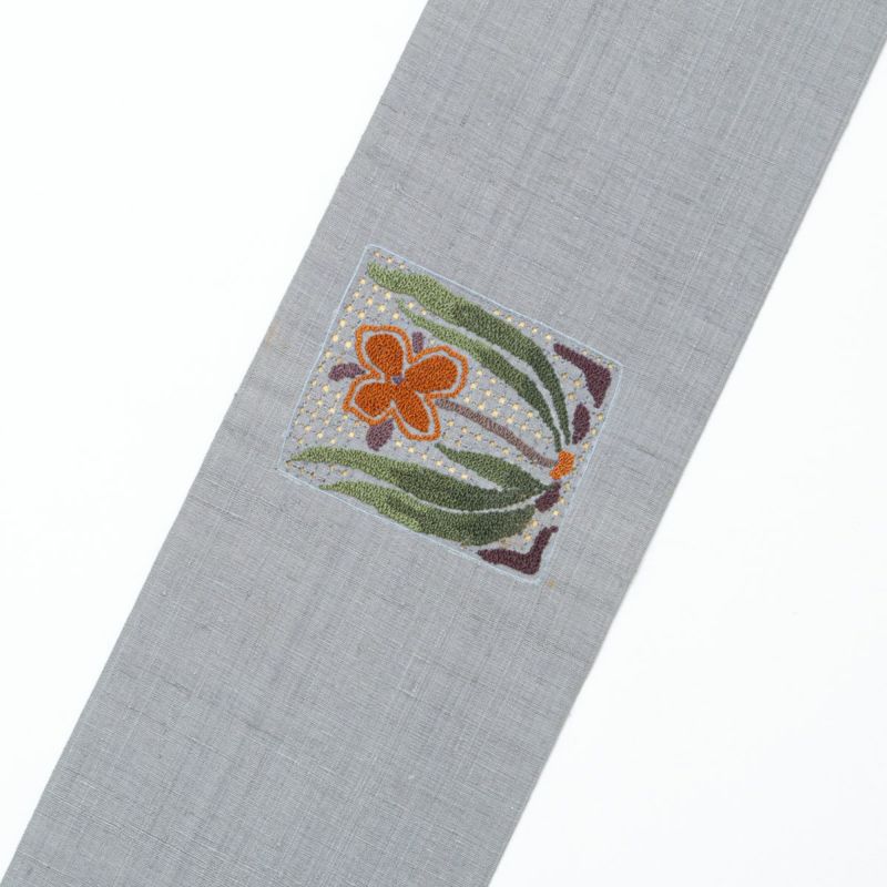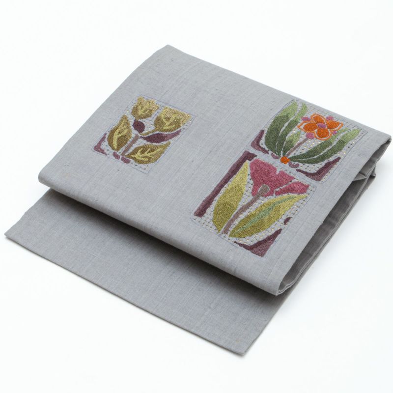 名古屋帯 中国三大刺繍 汕頭 相良刺繍 紬地 植物文様 グレー 西陣 正絹 九寸 です。