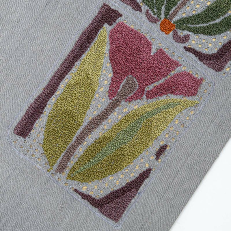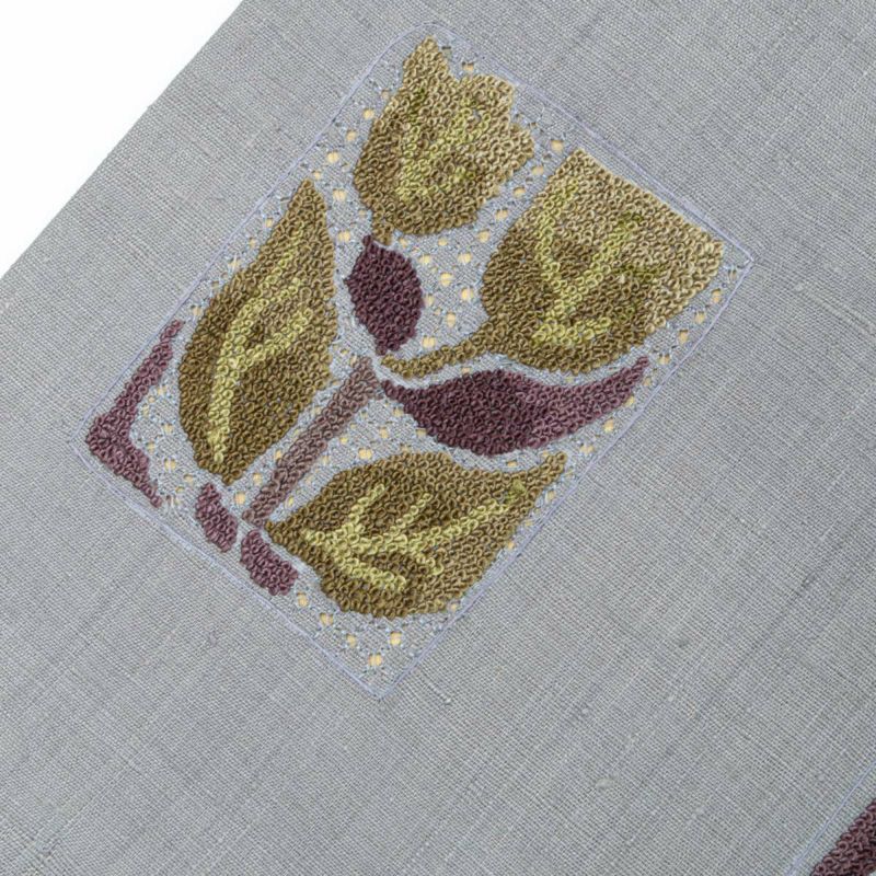 シックなグレー地に、四角のパネル状に配置された植物文様が立体的に浮かび上がり、手仕事の奥行きを感じさせます。
