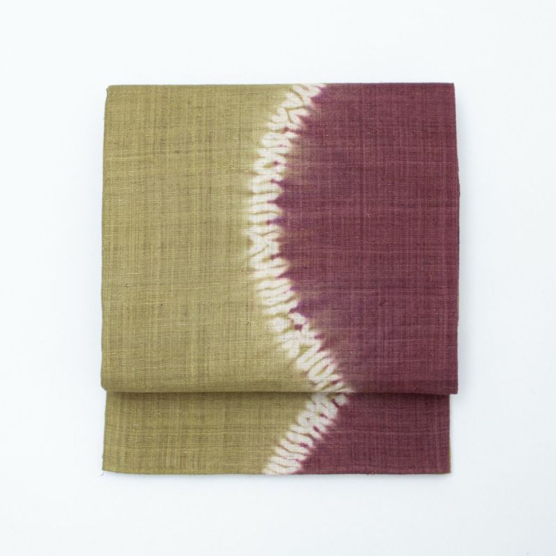 洒落袋帯 紬地 絞り染め 曲線 染め分け 紫 緑 桐生織 正絹です。