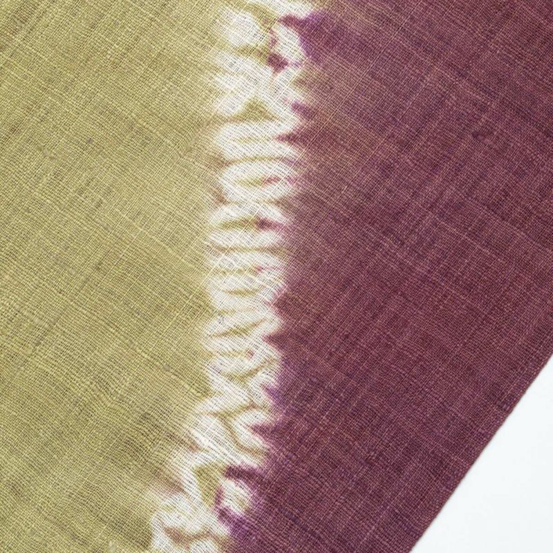 紫から緑への染め分けが美しく移ろい、手仕事ならではの味わい深い表情が魅力。ナチュラルな紬の質感に絞りの立体感が加わり、装いにアートのようなアクセントを添えてくれます。