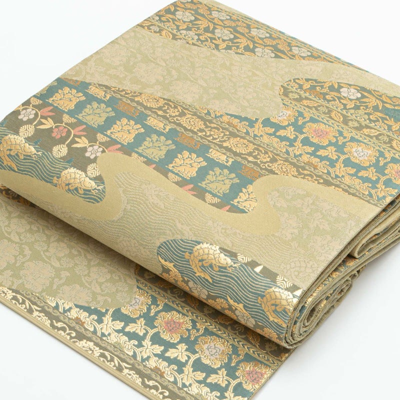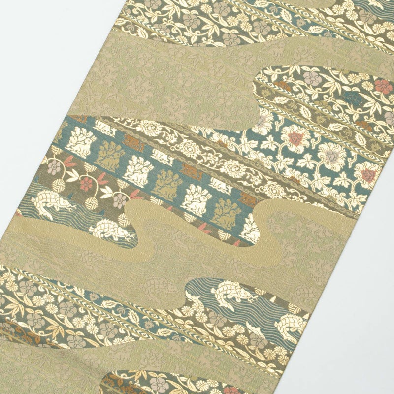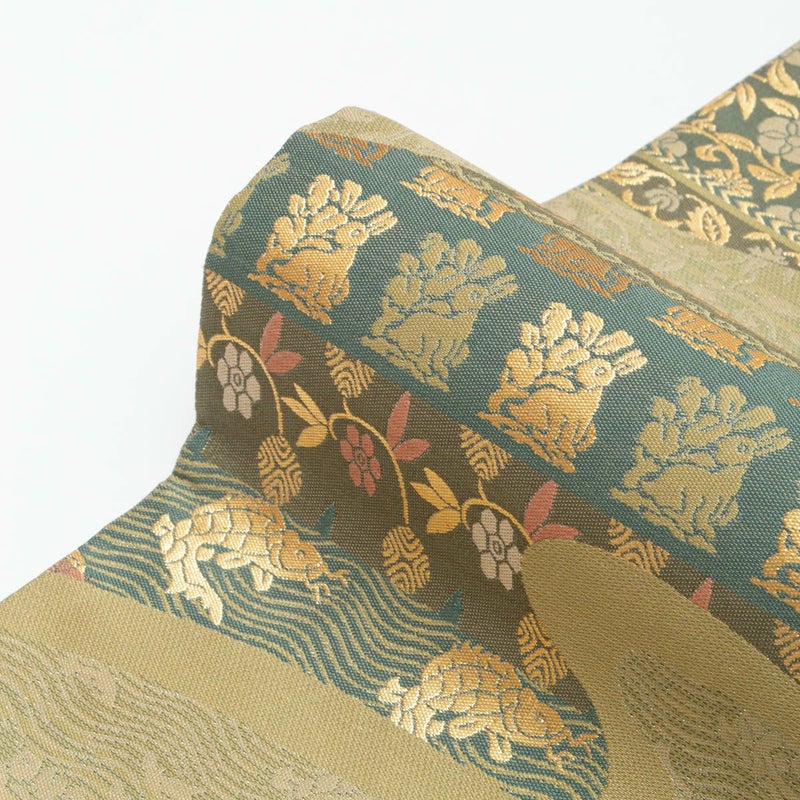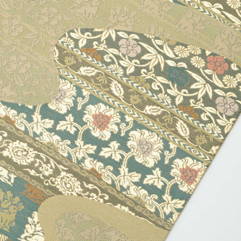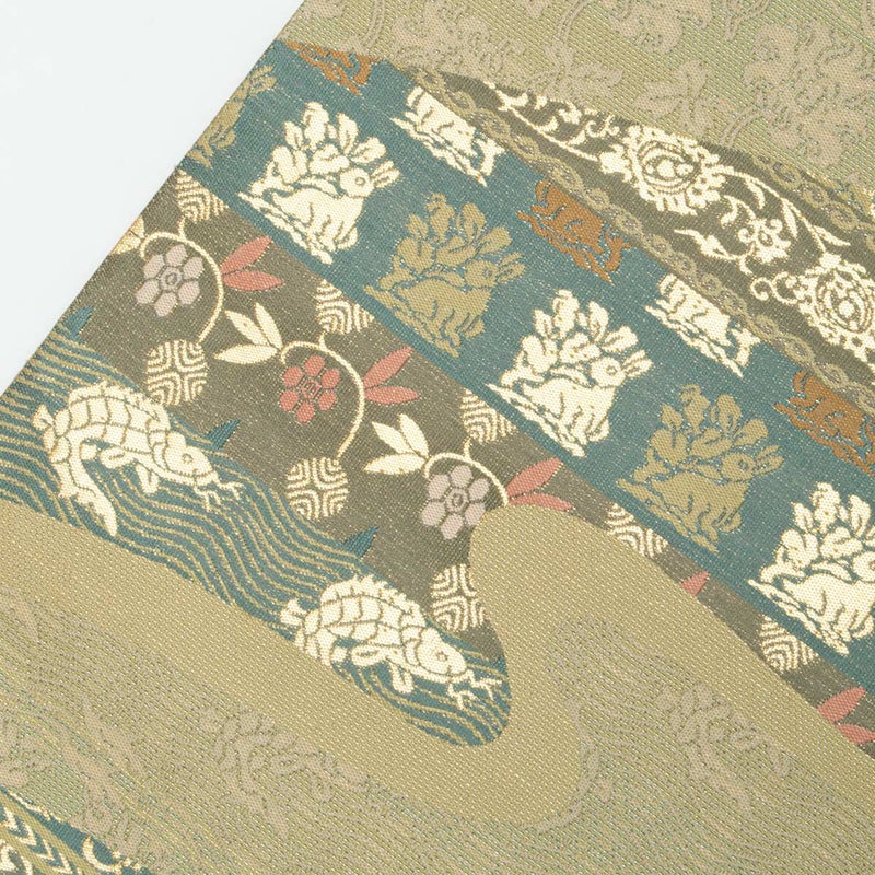 地色は落ち着きのある利休茶色や、渋みの青緑を基調とし、金糸の輝きが上品に映える配色。多彩な文様を用いながらも、全体として調和の取れた印象です。