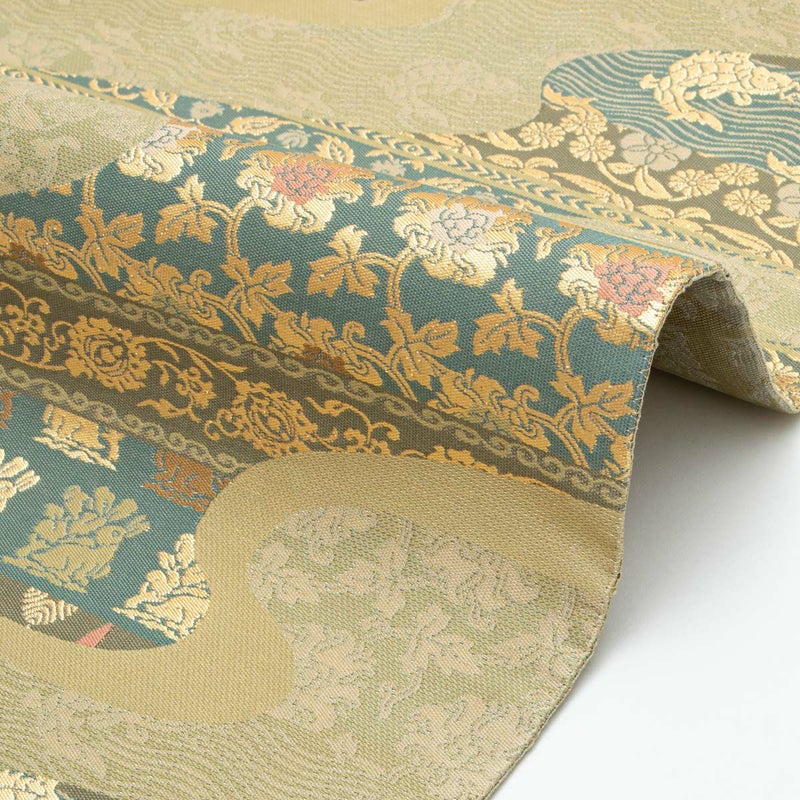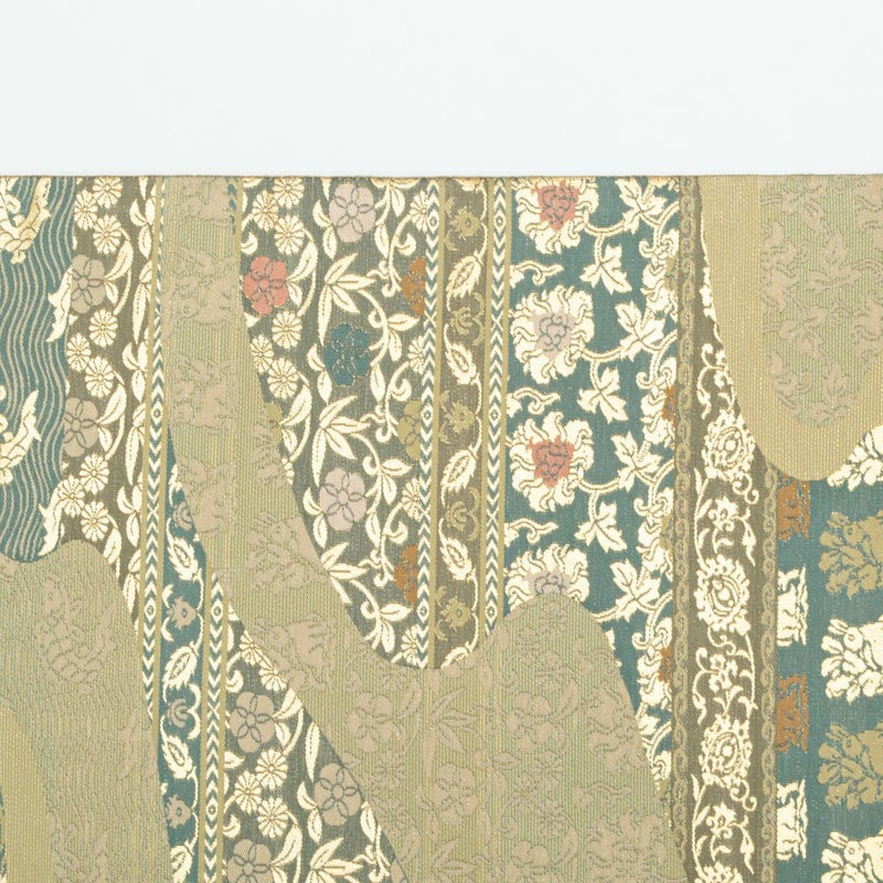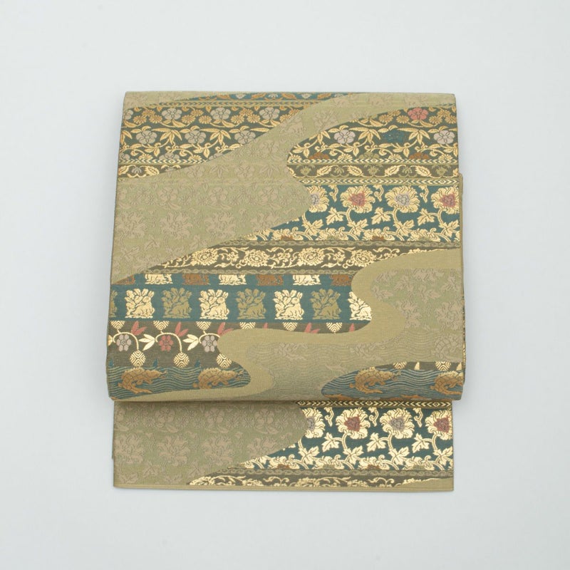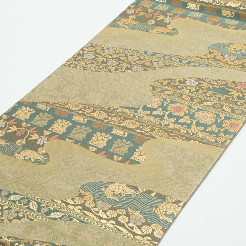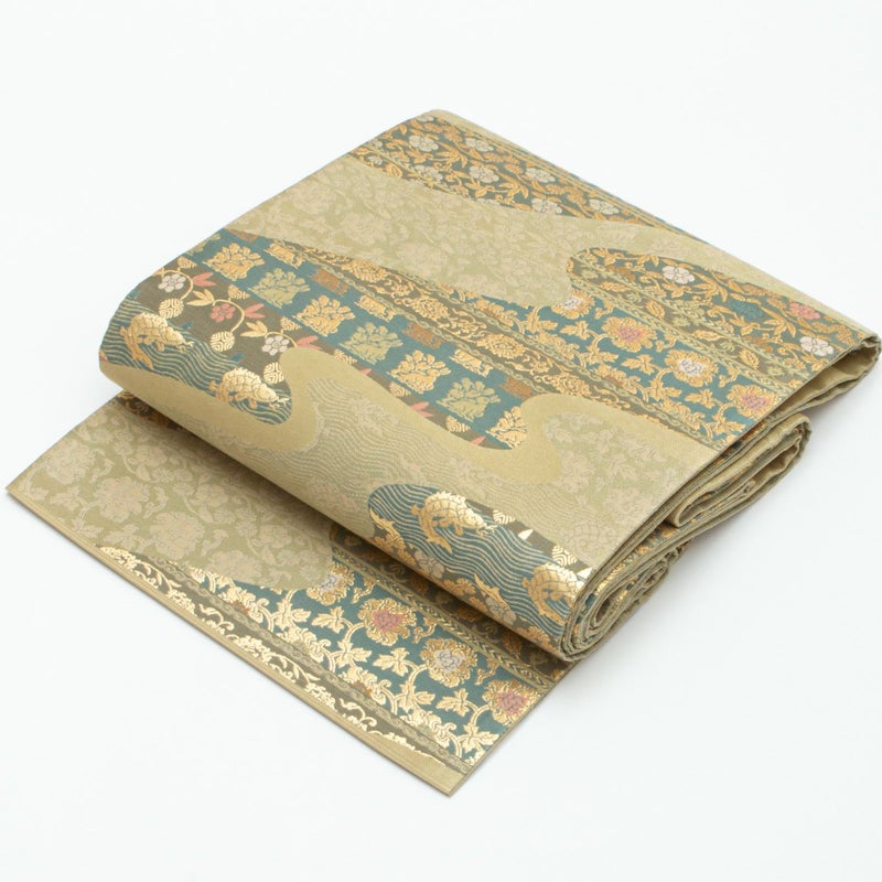 地色は落ち着きのある利休茶色や、渋みの青緑を基調とし、金糸の輝きが上品に映える配色。多彩な文様を用いながらも、全体として調和の取れた印象です。