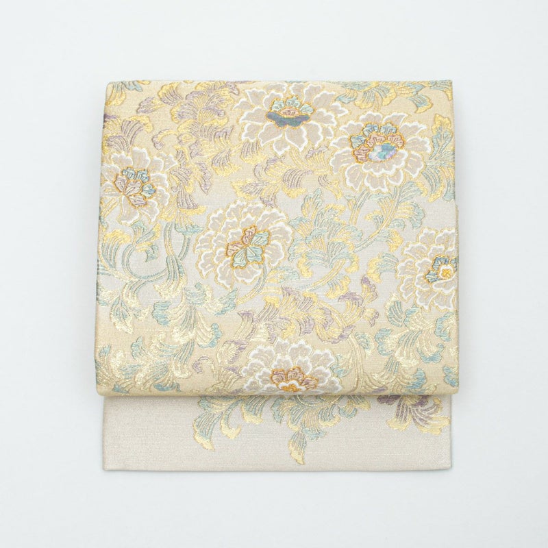 淡くきらめくプラチナベージュからゴールドの暈しを基調に、錆青磁や藤紫の色糸を織り交ぜた、宮田織物ならではの上質な袋帯です。