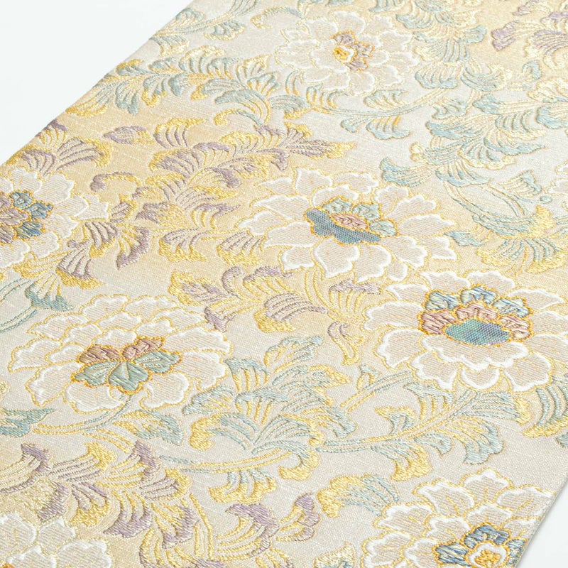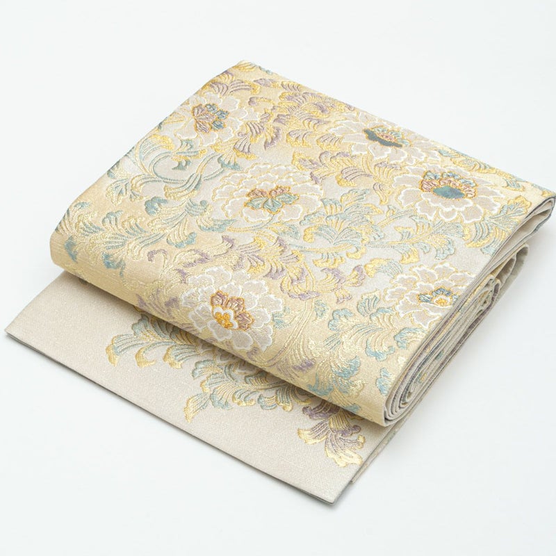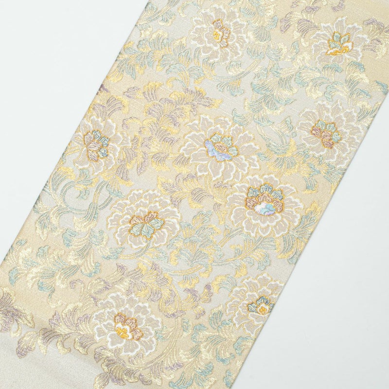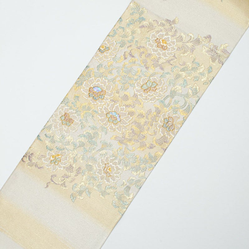 花唐草文を横段暈しの構成で表現し、柔らかな色の移ろいが帯全体に奥行きを与えています。
