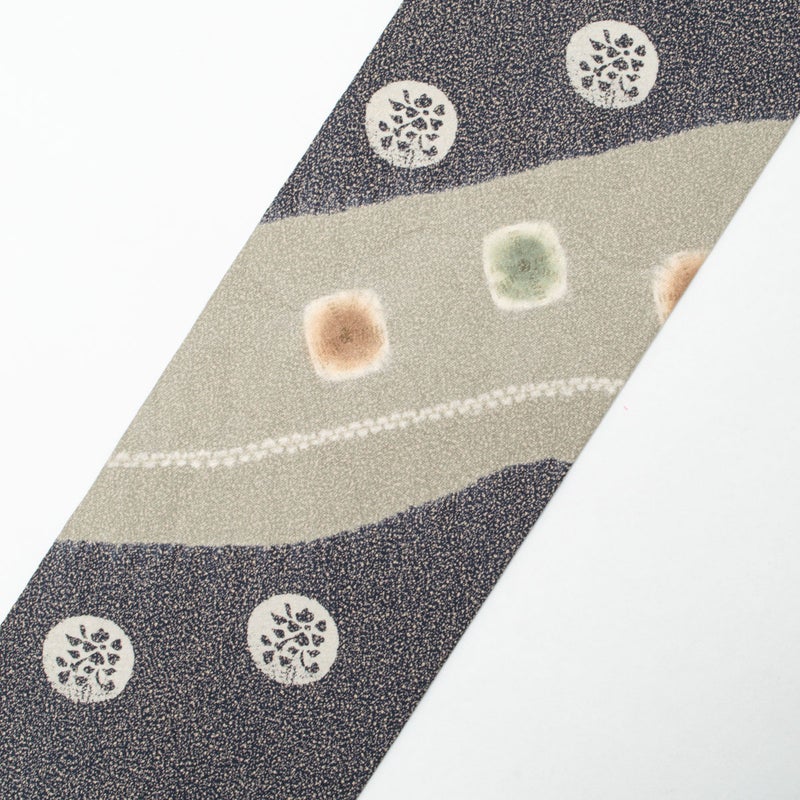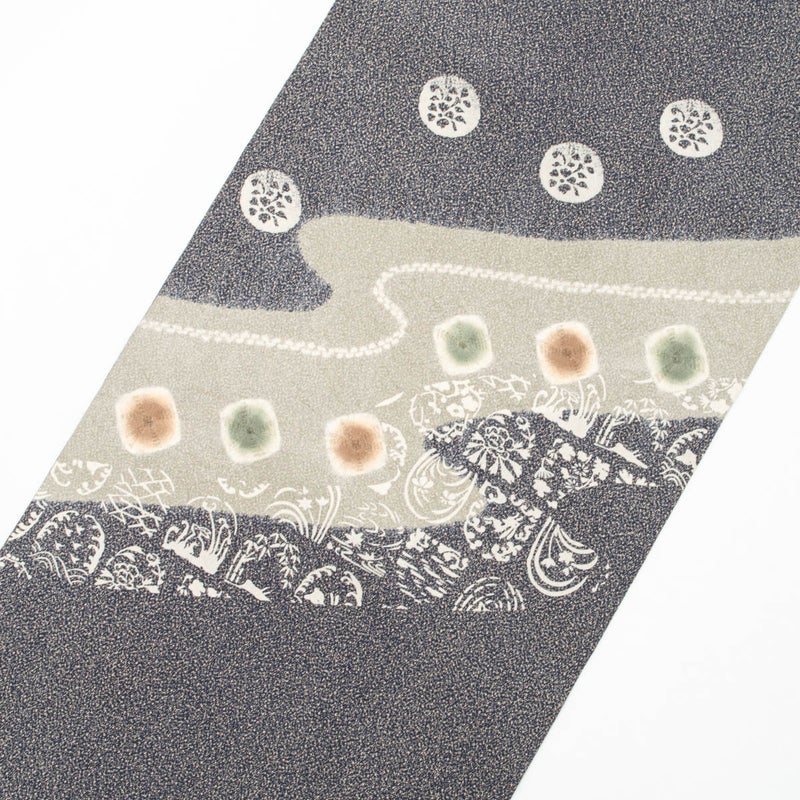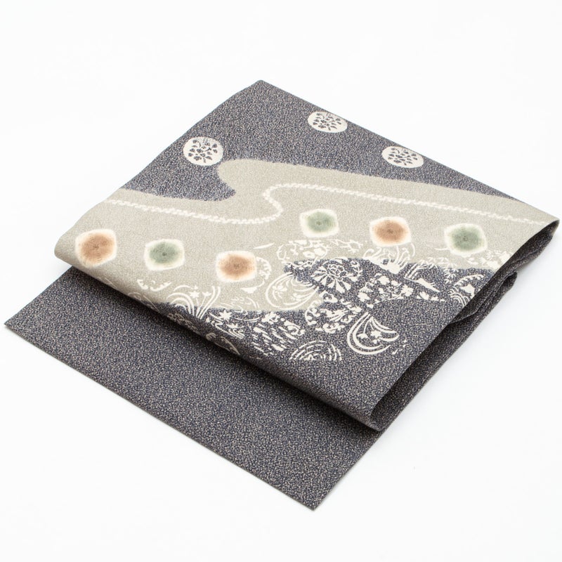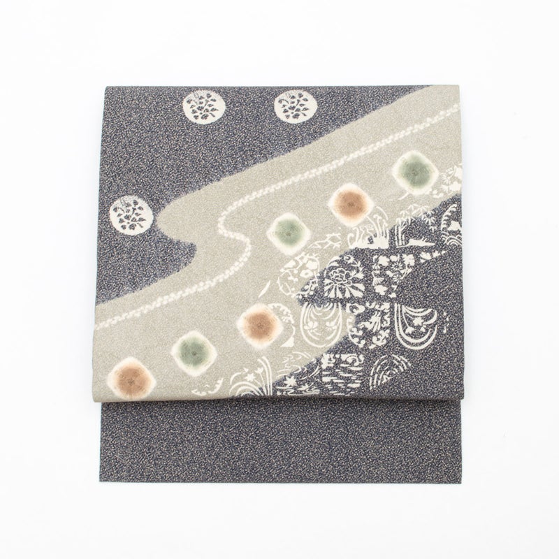 静かな夜の景色を思わせる墨色のたたき染めに、やわらかな曲線と愛らしい兎が浮かび上がる趣ある名古屋帯です。