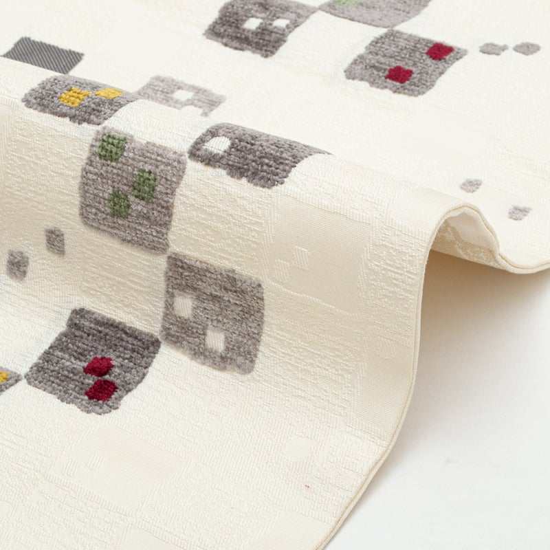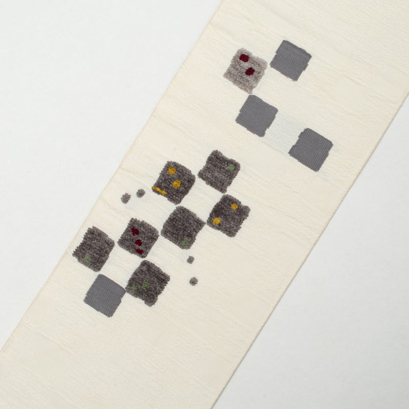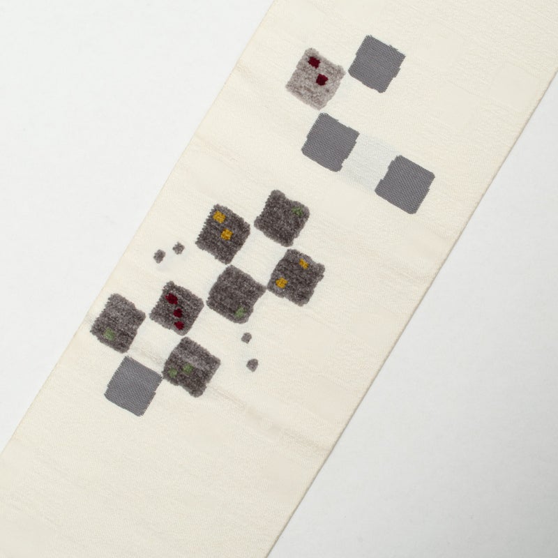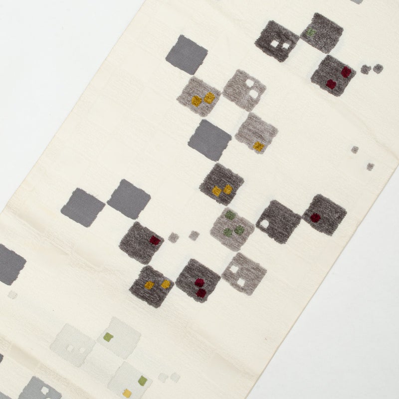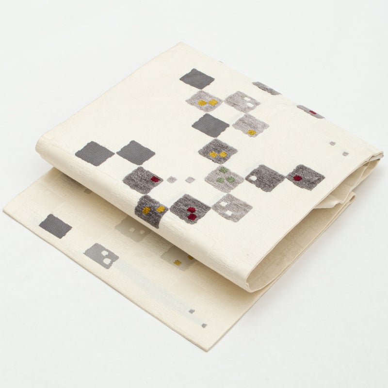 やわらかな白地に、モール織で表現されたスクエア文様が浮かび上がる名古屋帯です。