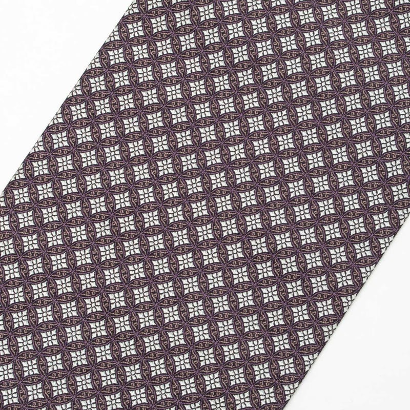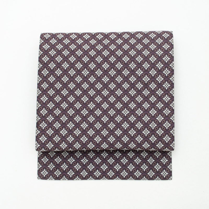黒地に紫と白で織り出された七宝繋ぎ文様が、端正に広がる名古屋帯です。