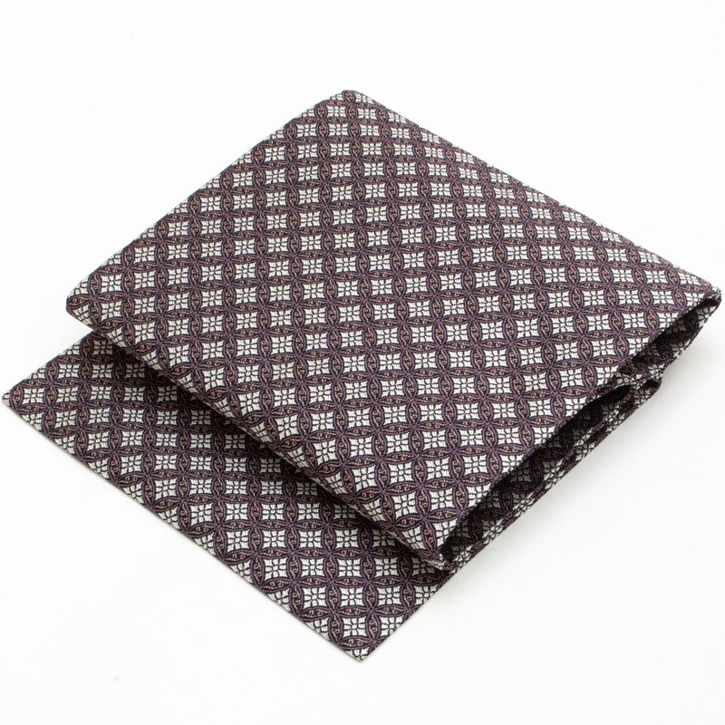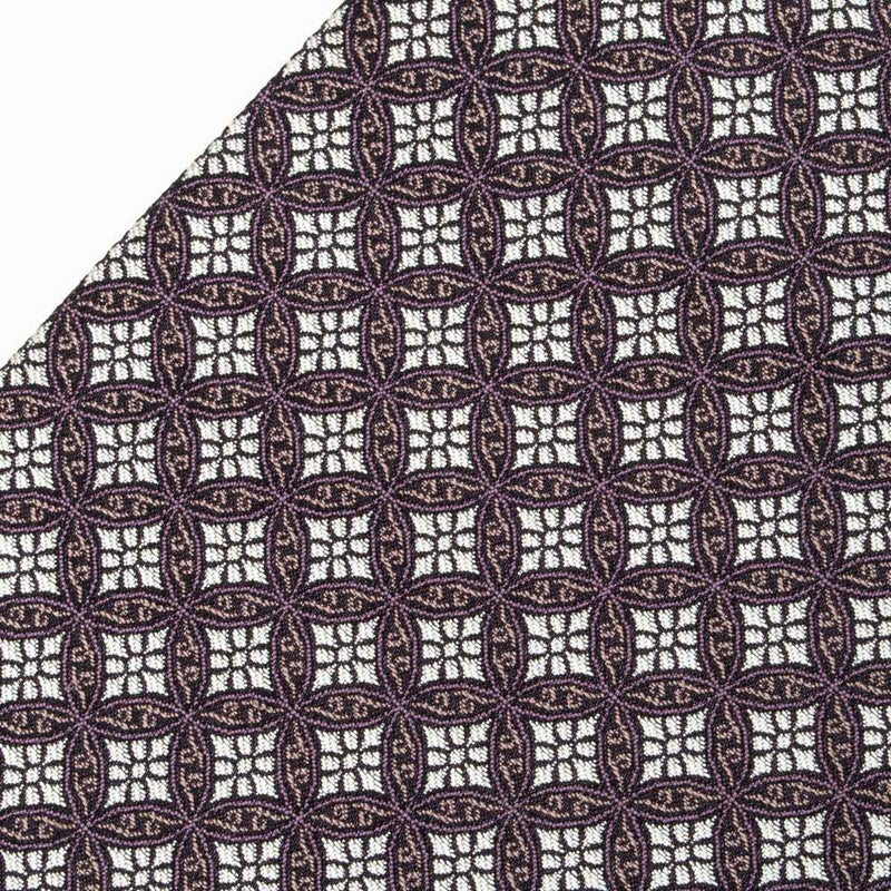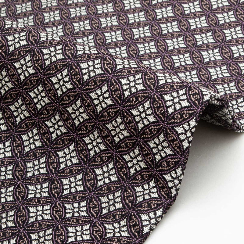 規則的な幾何の連なりが美しく、落ち着いた配色の中にさりげない華やぎを感じさせます。