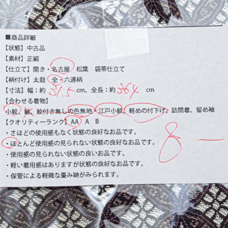 【美品】名古屋帯 七宝繋ぎ 黒 紫 白 西陣織 正絹 九寸です。