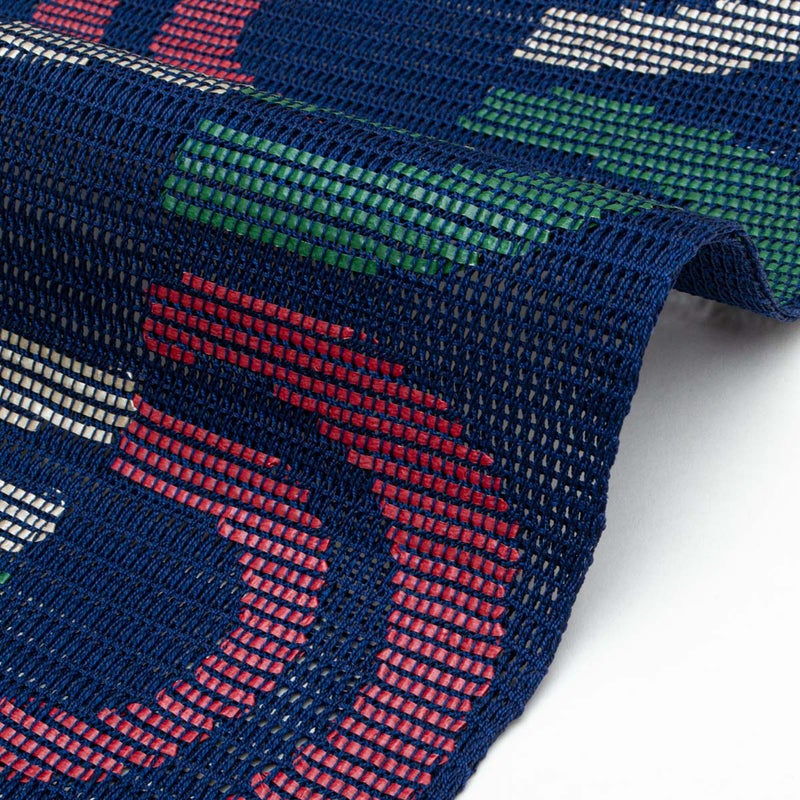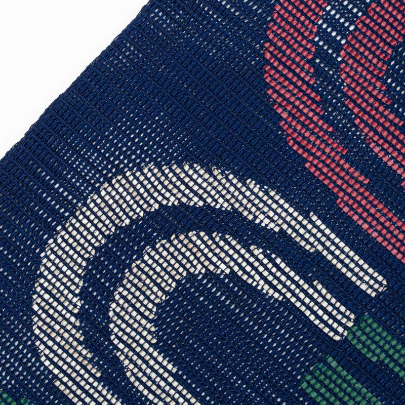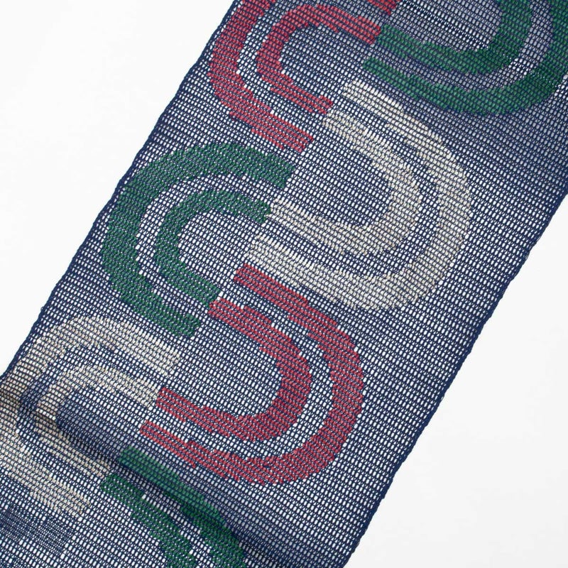 深みのある紺地に、白・赤・緑の配色で曲線を大胆に配した、羅織の名古屋帯です。
