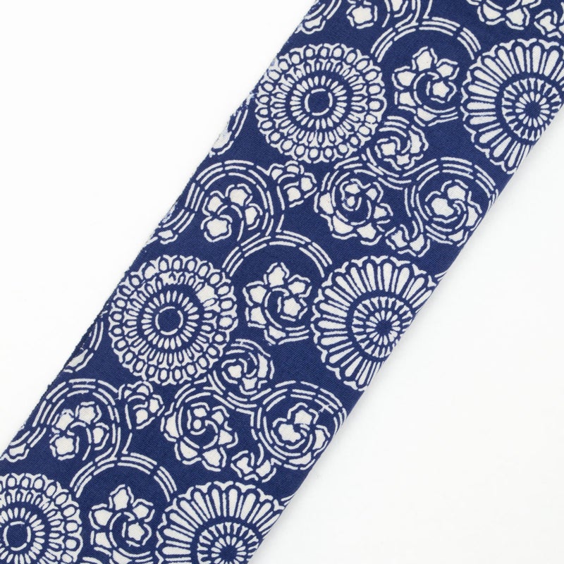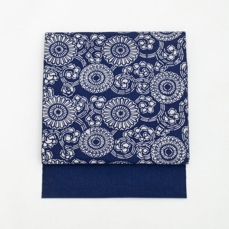 深みのある青地に、白で染め抜かれた菊唐草文が映える、型絵染めの名古屋帯です。