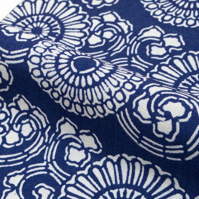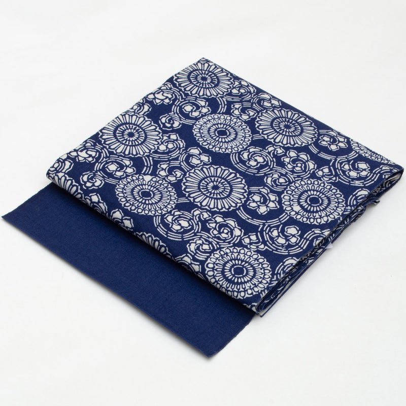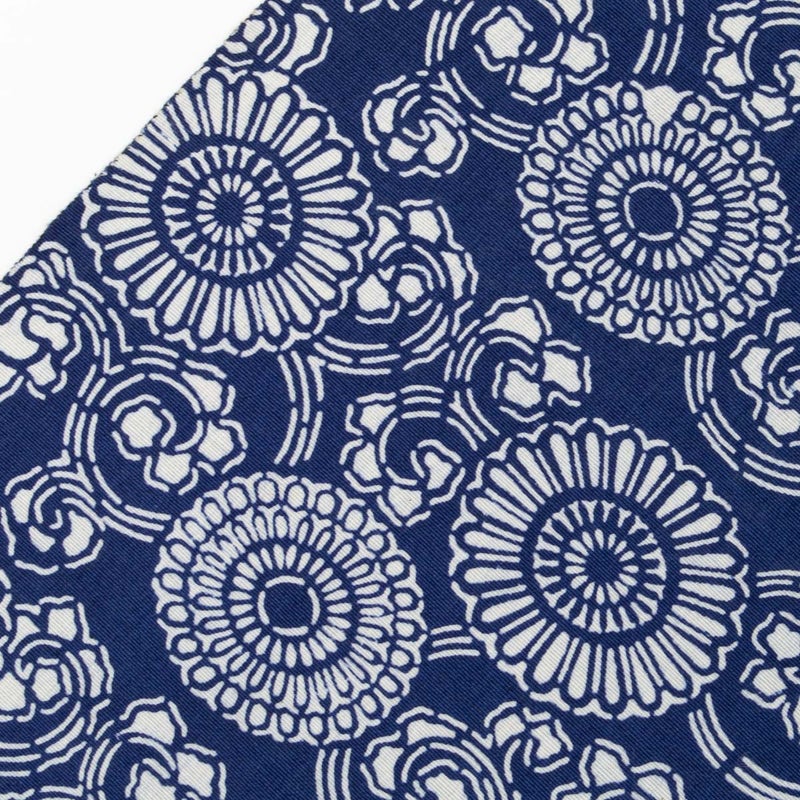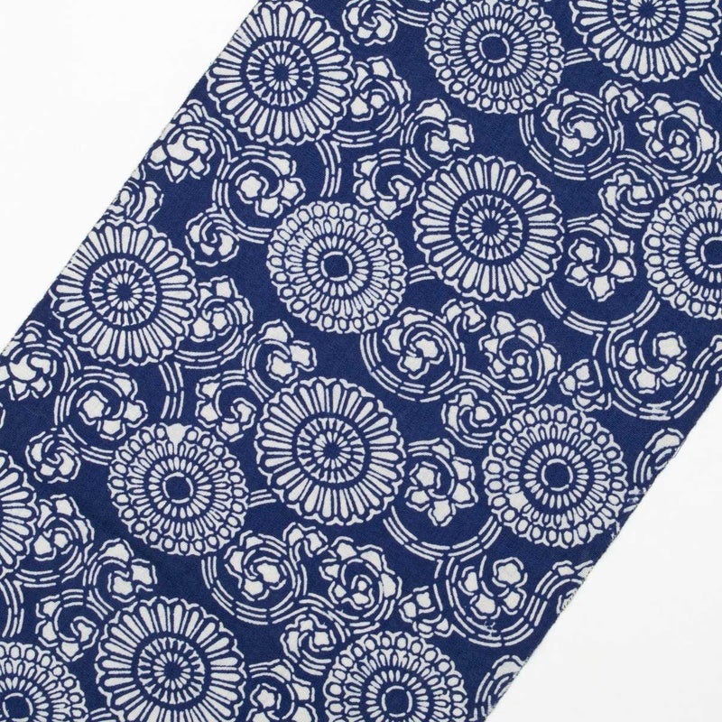 菊花の端正な円文と、やわらかく連なる唐草が軽やかなリズムを生み、染めならではのすっきりとした表情に仕上がっています。