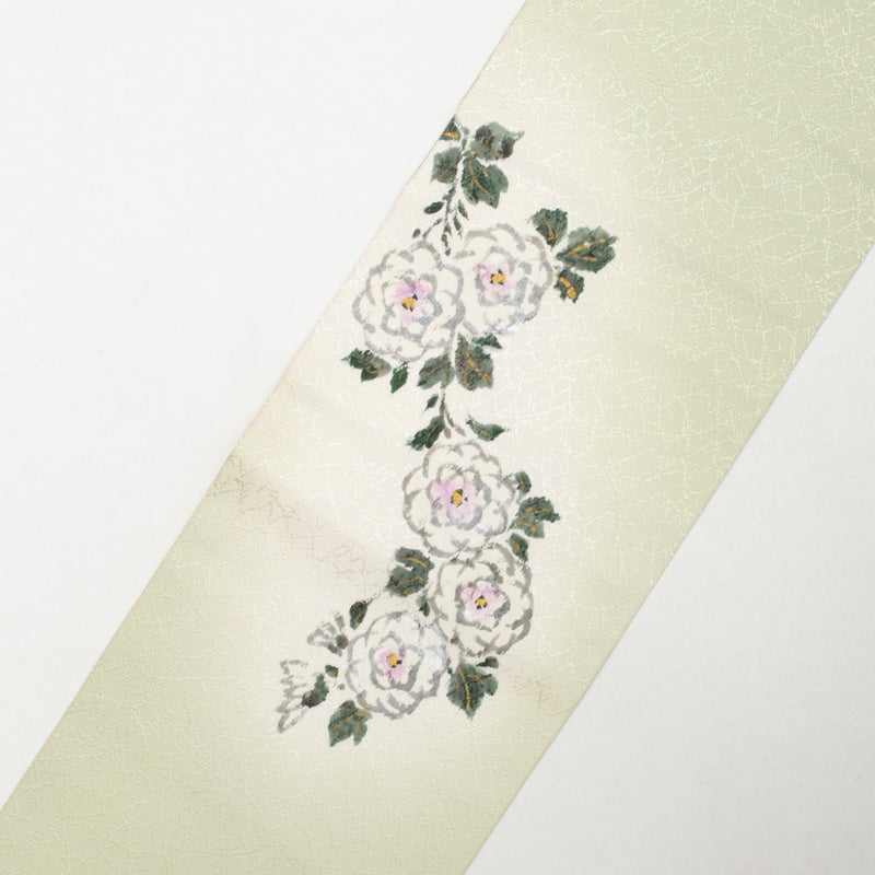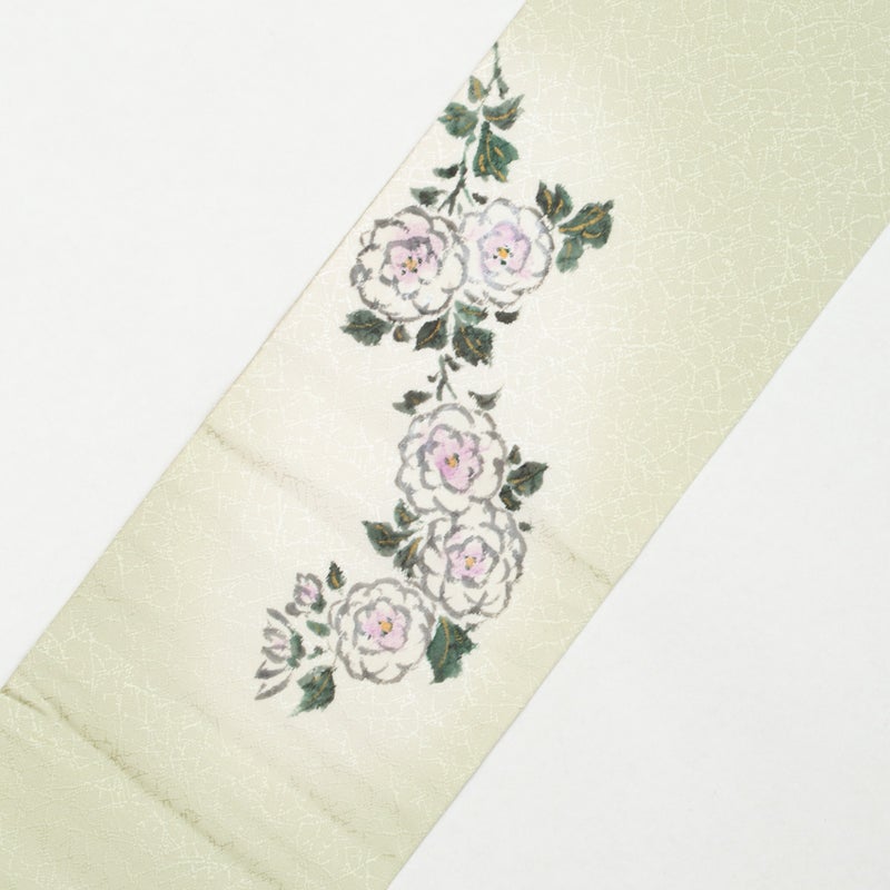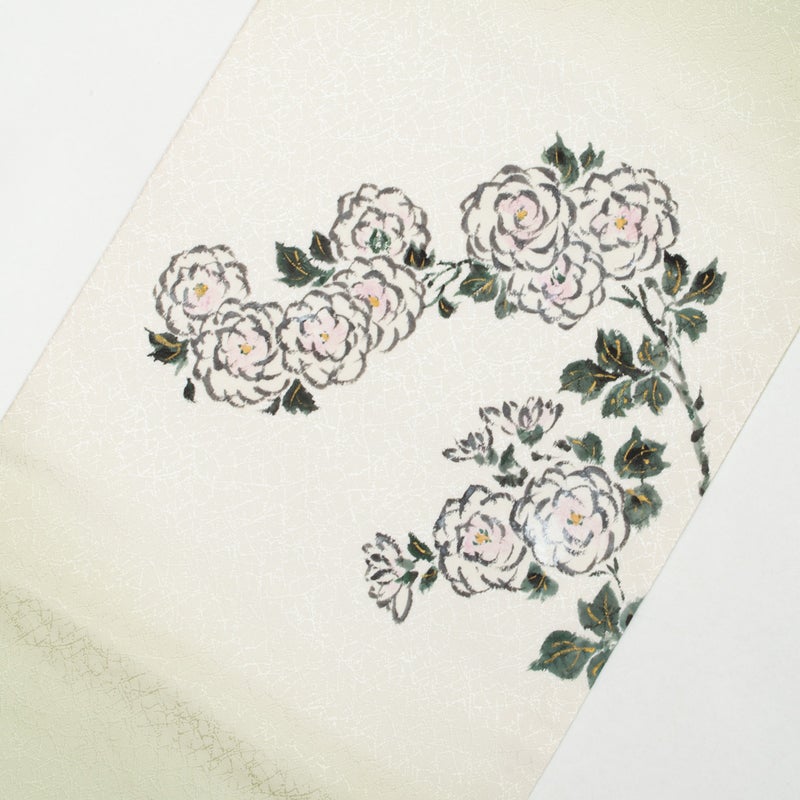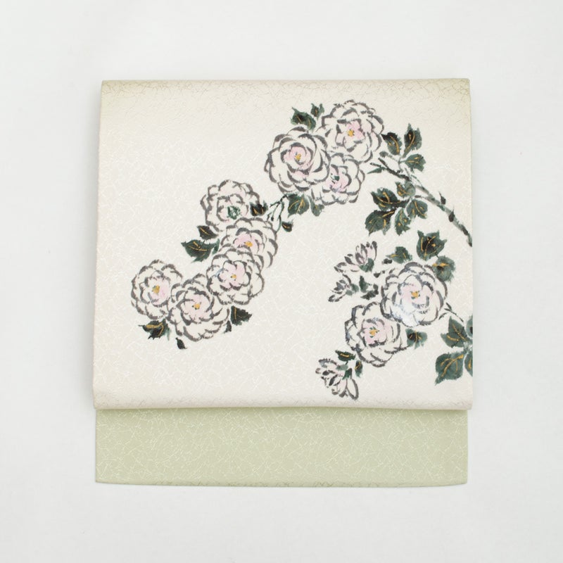 名古屋帯 友禅 手描き 洋菊の図 暈し オフホワイト 黄緑 正絹 九寸です。