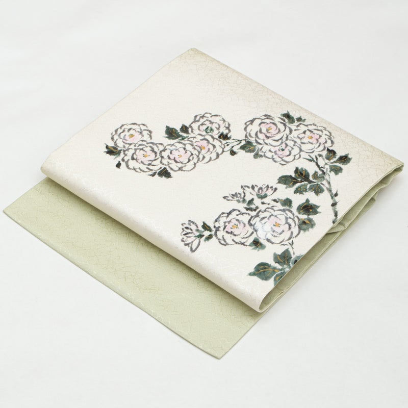 やわらかなオフホワイトの地に、手描き友禅で洋菊をあしらった名古屋帯です。