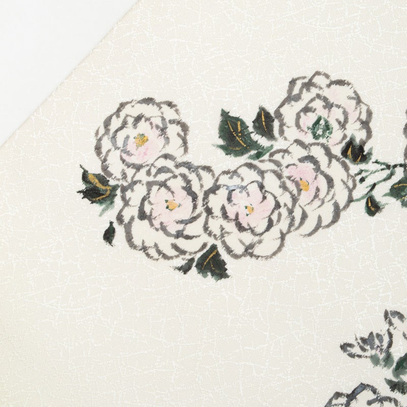 輪を描くように配された花々は、かすれを活かした筆致で表現され、ほんのりと色づく花芯や葉の濃淡が、軽やかな奥行きを生み出しています。