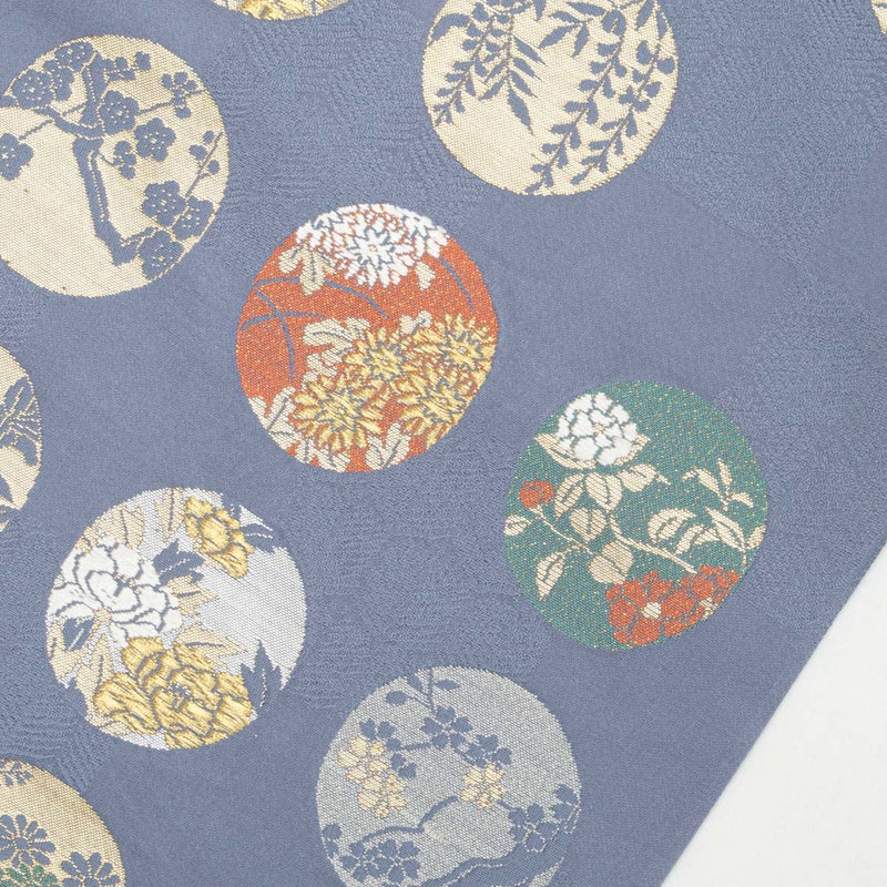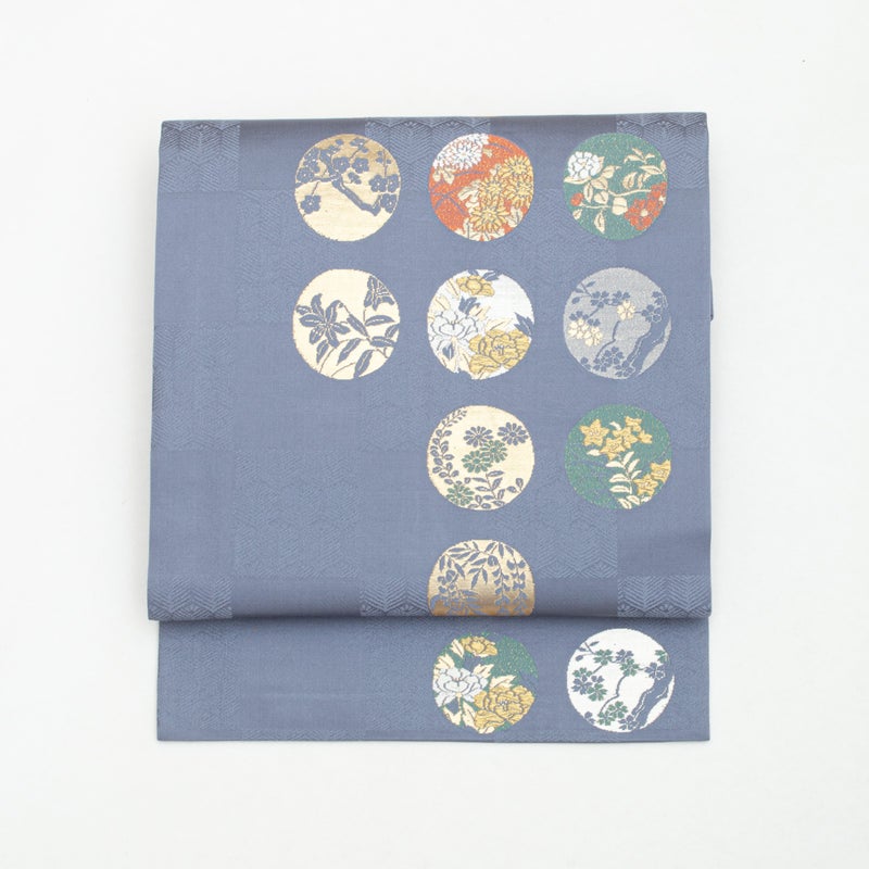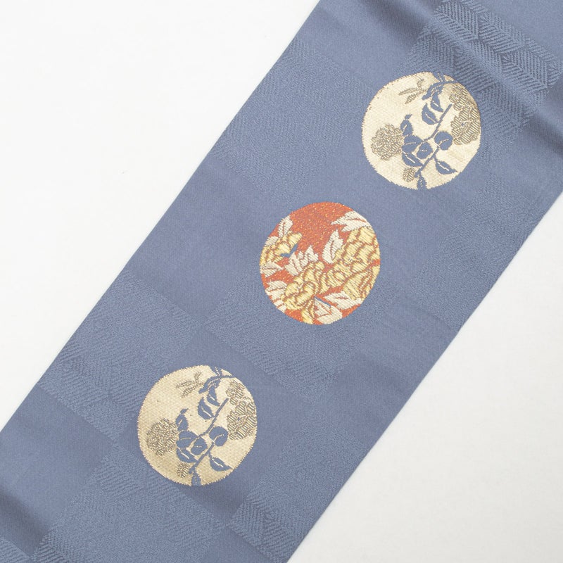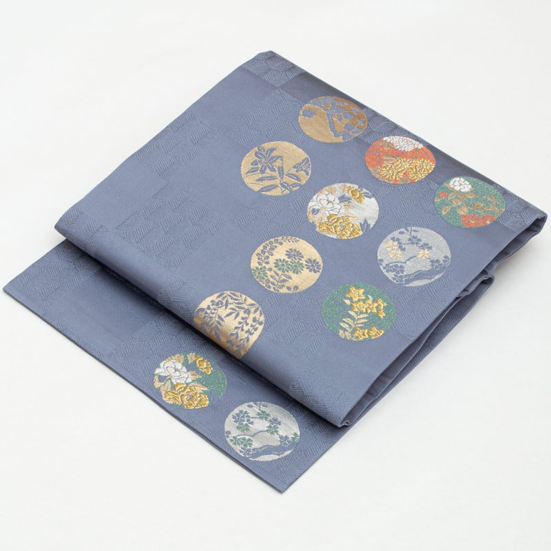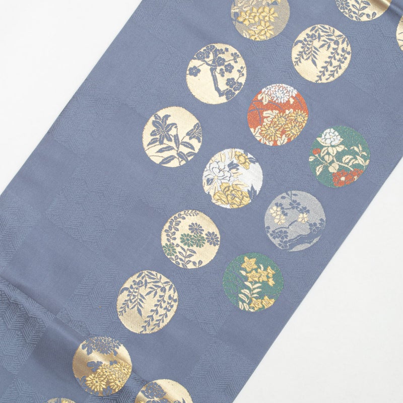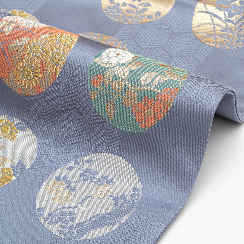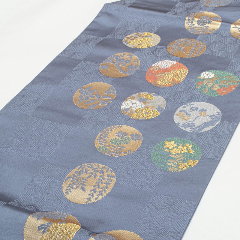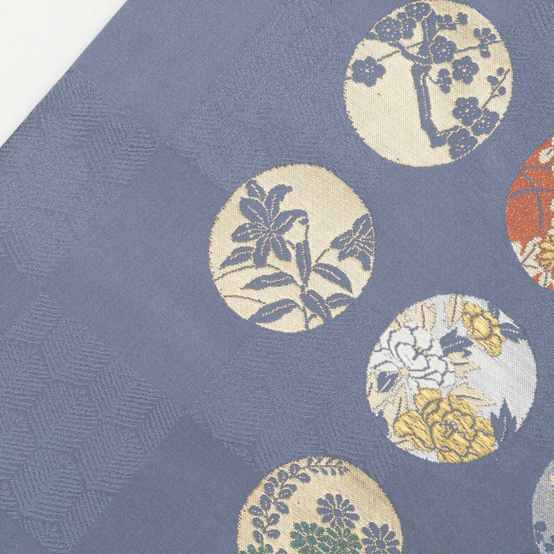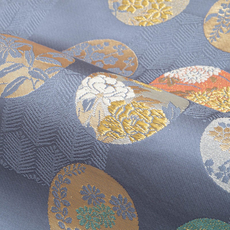 市松に織り出された松葉亀甲の地紋の上に、四季折々の花を込めた丸文が配され、金糸のほのかな輝きが華やぎを添えます。