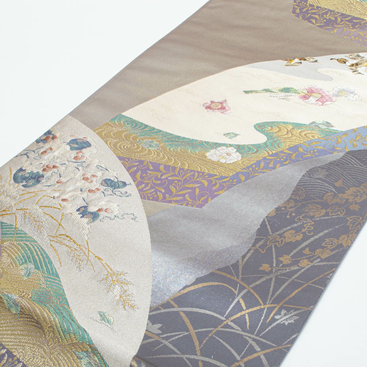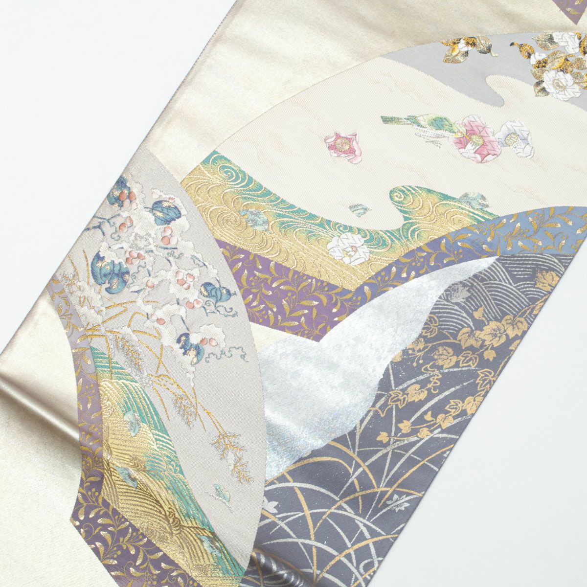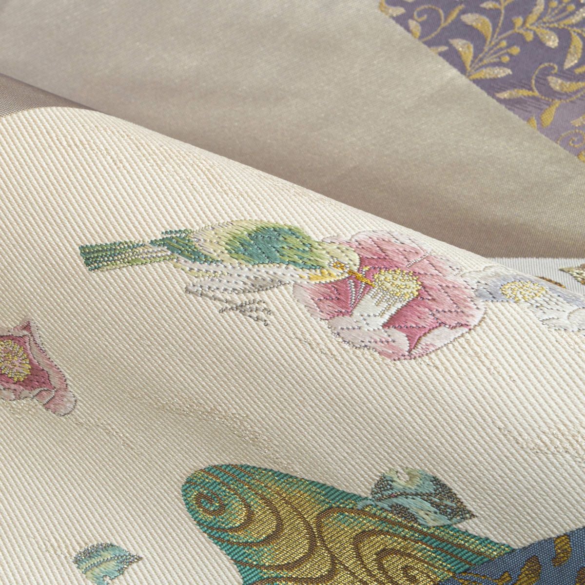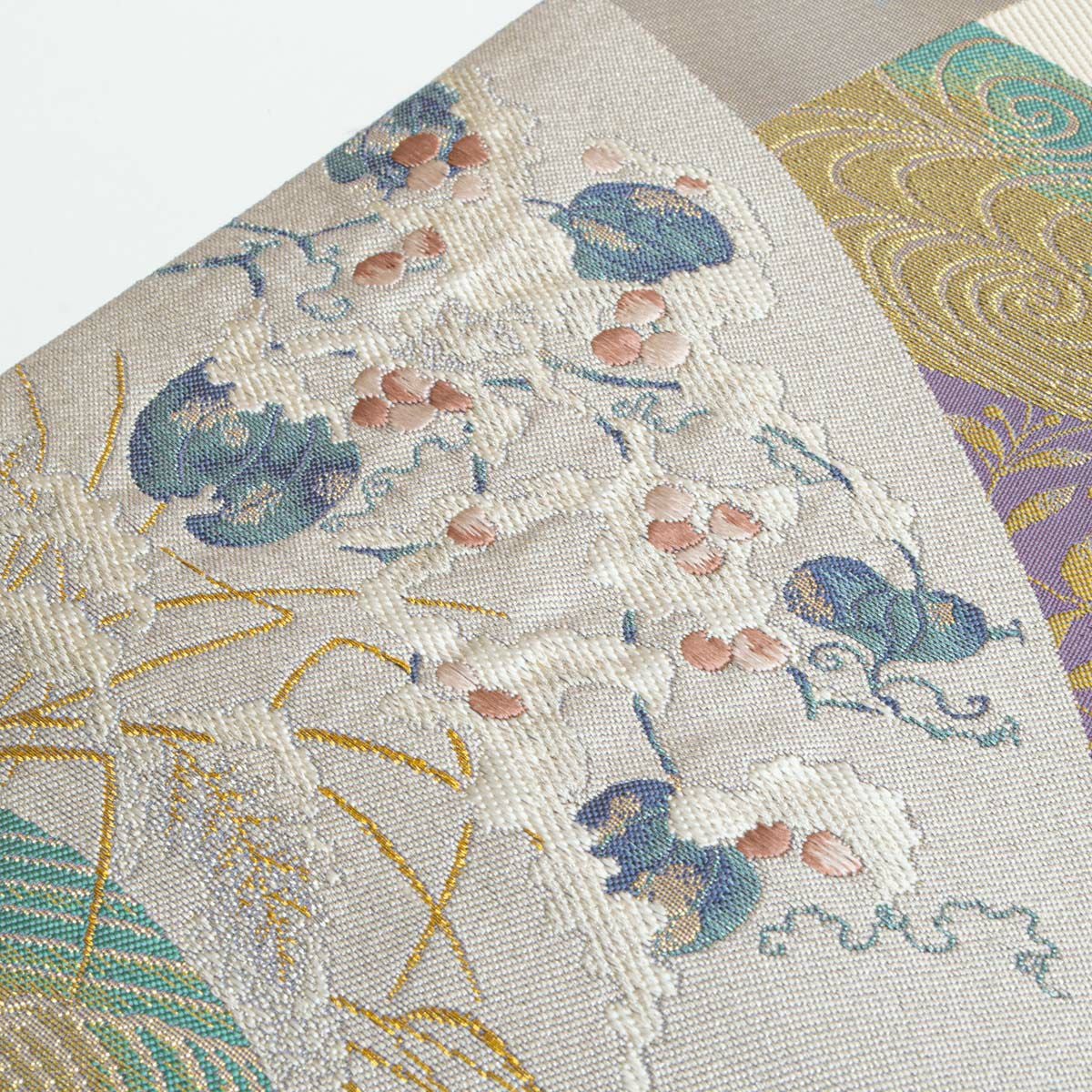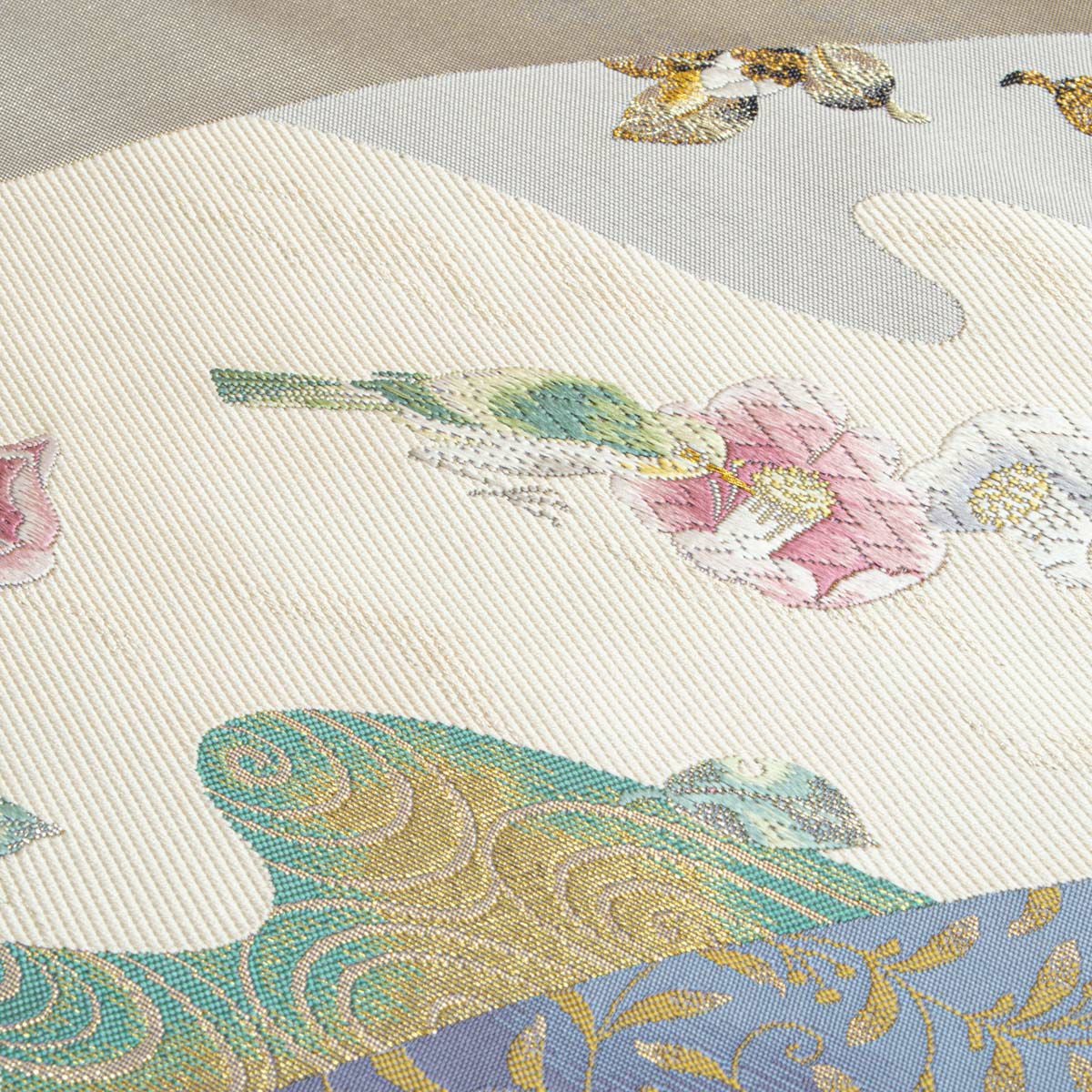 他の画像を見る 袋帯 唐織 唐花文繋ぎ ラメ糸織 パールホワイト 青磁 薄紫 薄群青 横段取り 西陣織 正絹 礼装用 当店特別価格 ¥ 22,000 税込 SOLD OUT 詳細を見る お気に入りに登録する