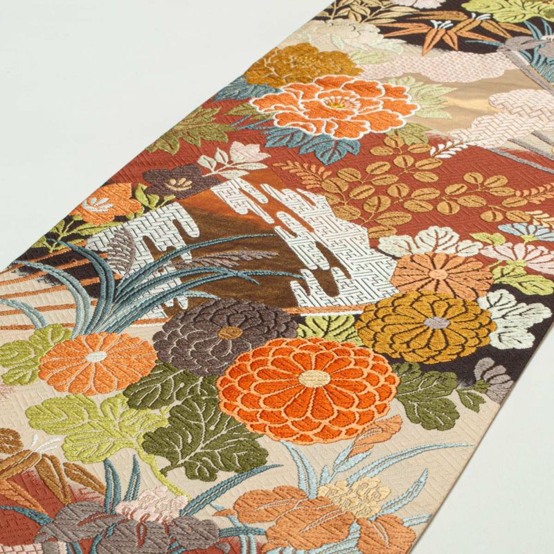 扇面を配した構図に、菊、牡丹、桜、杜若などの四季花がふんだんに織り込まれ、季節を問わず華やかな装いをお楽しみいただけます。
