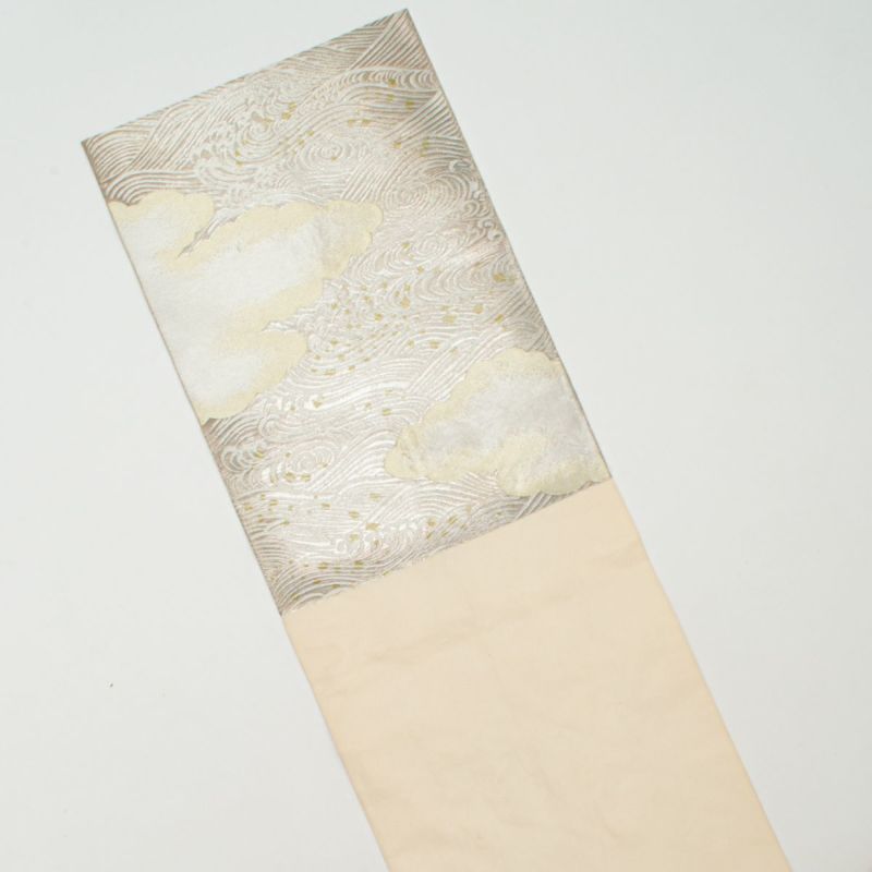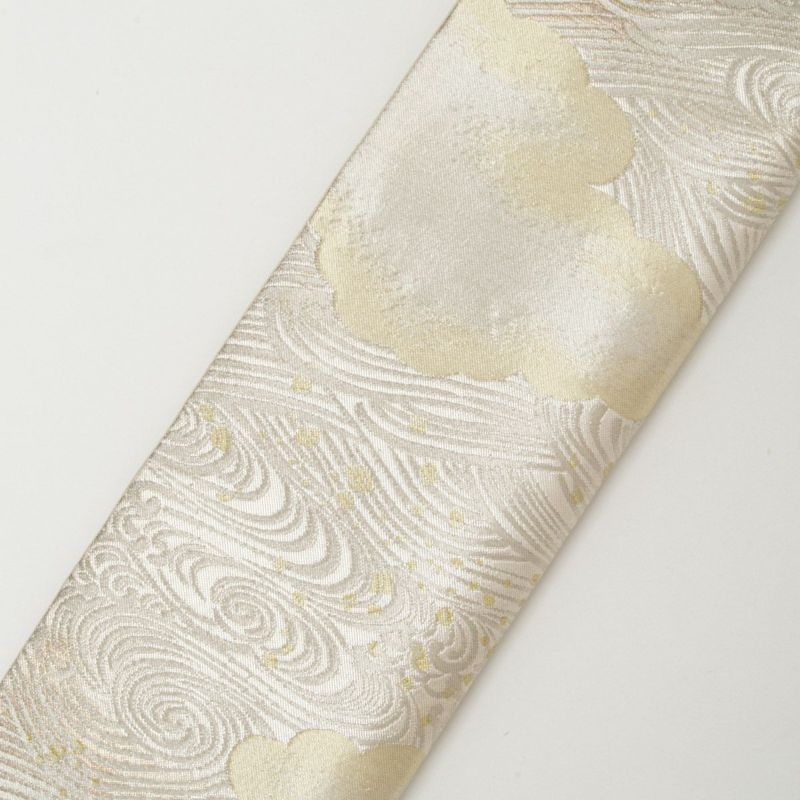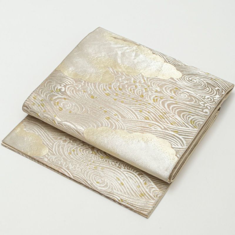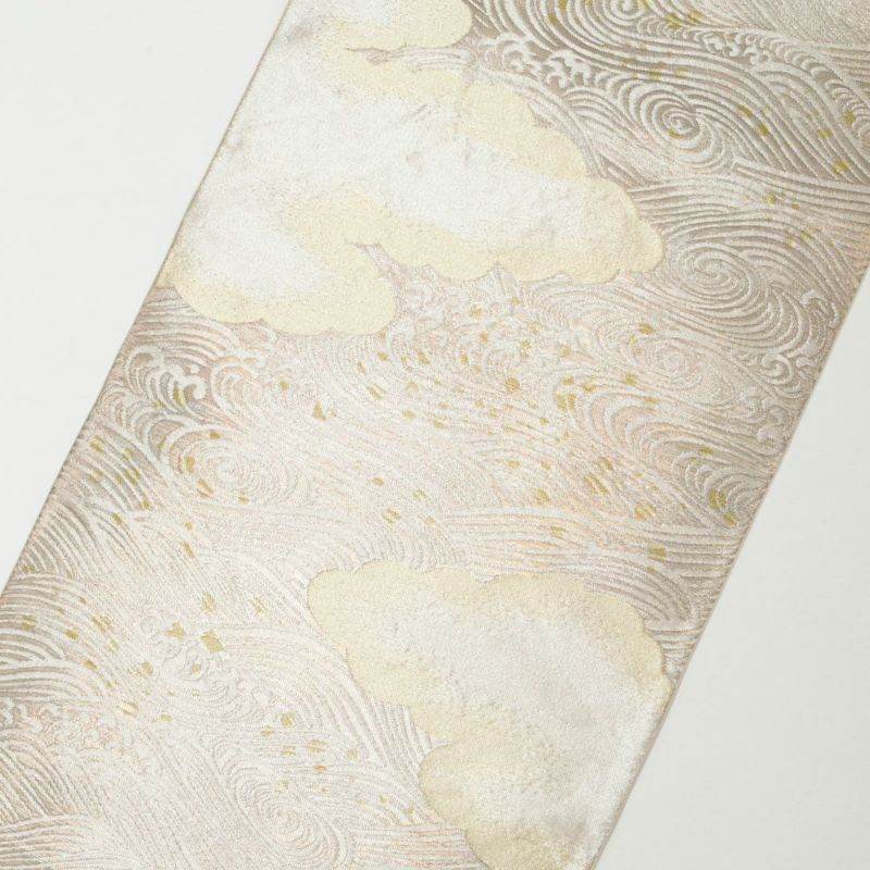 オフホワイトを基調に、銀糸と金糸を織り交ぜた華やかな地に、波文様と雲取りの意匠が美しく織り出されています。