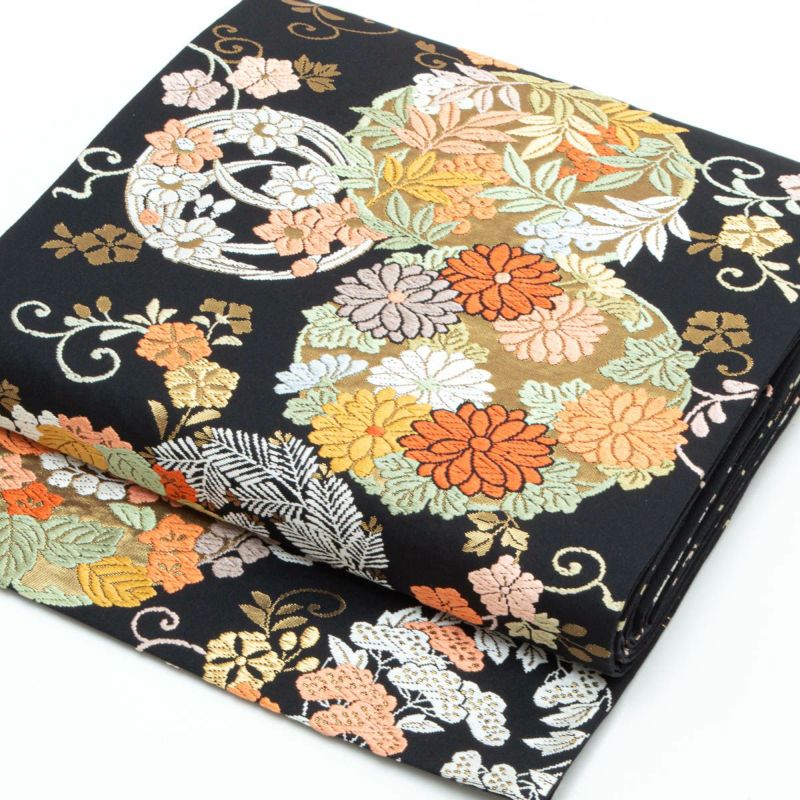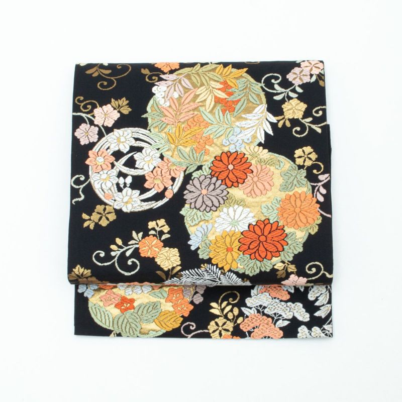 漆黒の地に、唐織で織り出された四季花の丸文が華やかに咲き誇る西陣織の袋帯です。