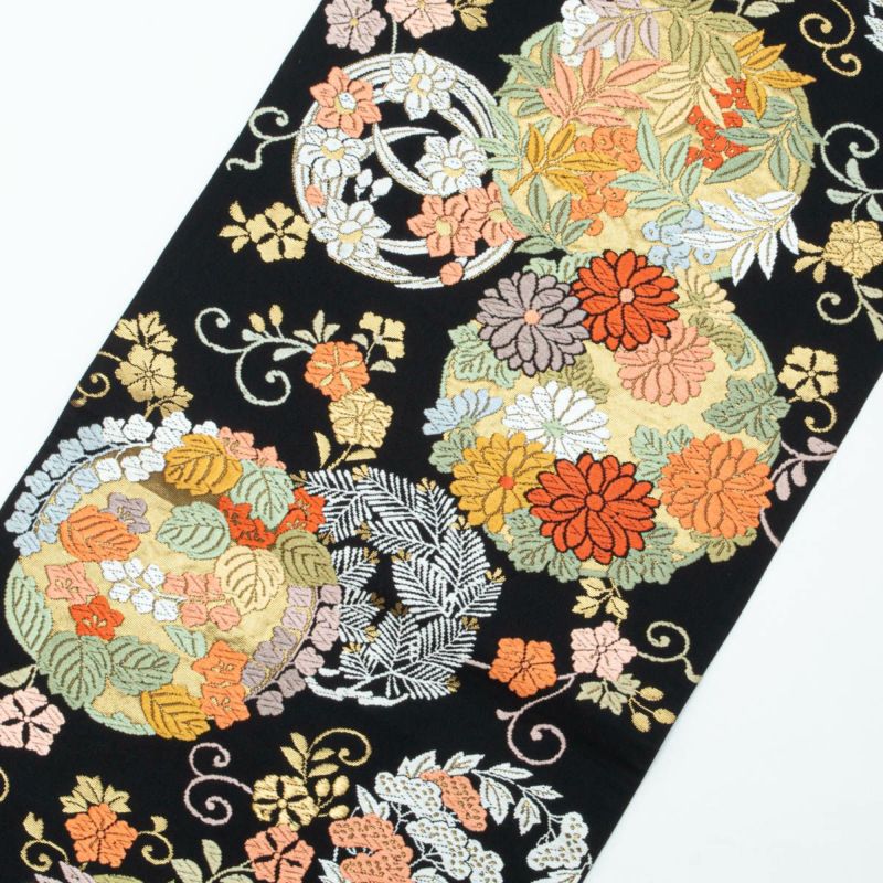 花々は丸文として配置され、華やかさの中にも整った格式が漂います。色とりどりの花弁や葉には淡いパステル調の配色も交えられ、黒地とのコントラストが美しく映えます。