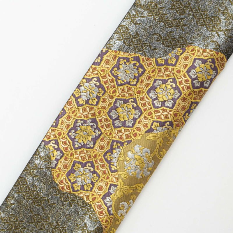 紫・黄土・金・銀など多彩な色調が調和し、装いに深みと華やぎを添える一本です。