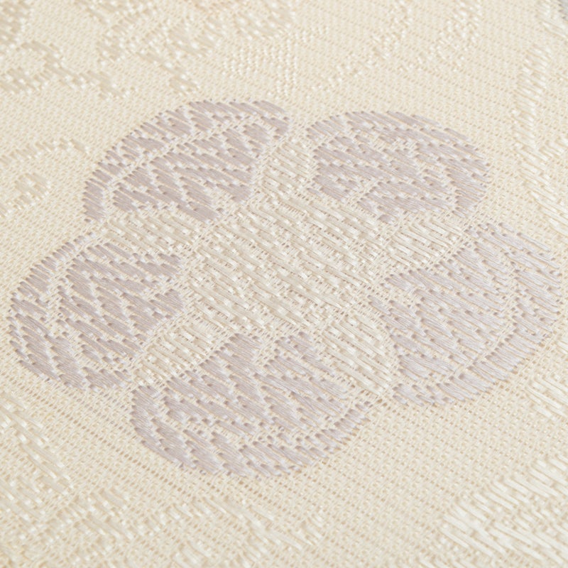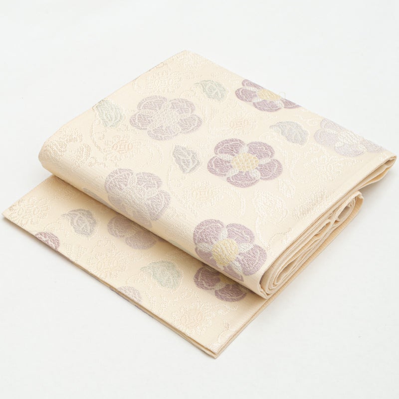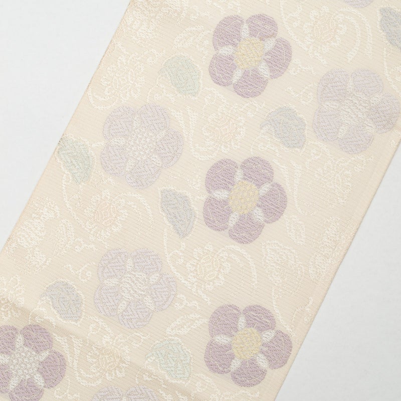 やわらかなオフホワイト地に、花唐草文が淡い色彩で織り出された絽の袋帯です。