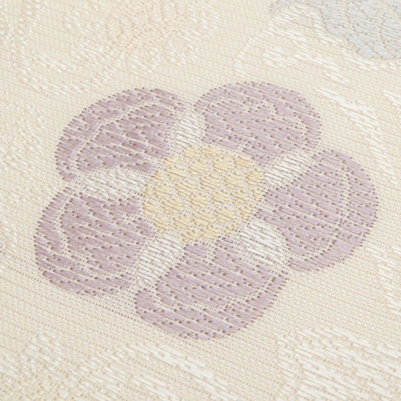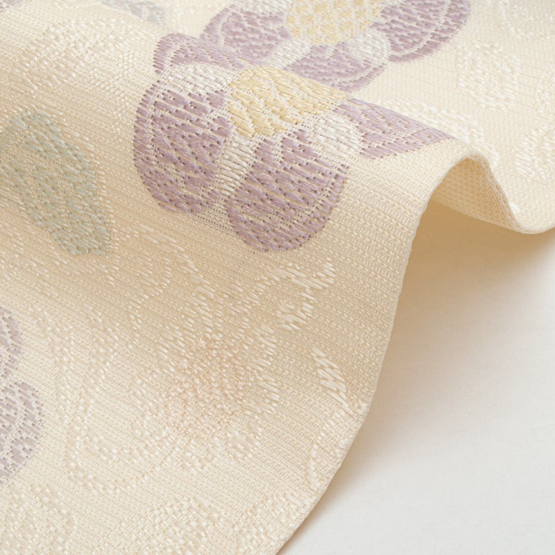 唐織ならではのふっくらとした織りに、藤色や淡緑などのペールトーンがやさしく重なり、軽やかで涼やかな印象に仕上がっています。