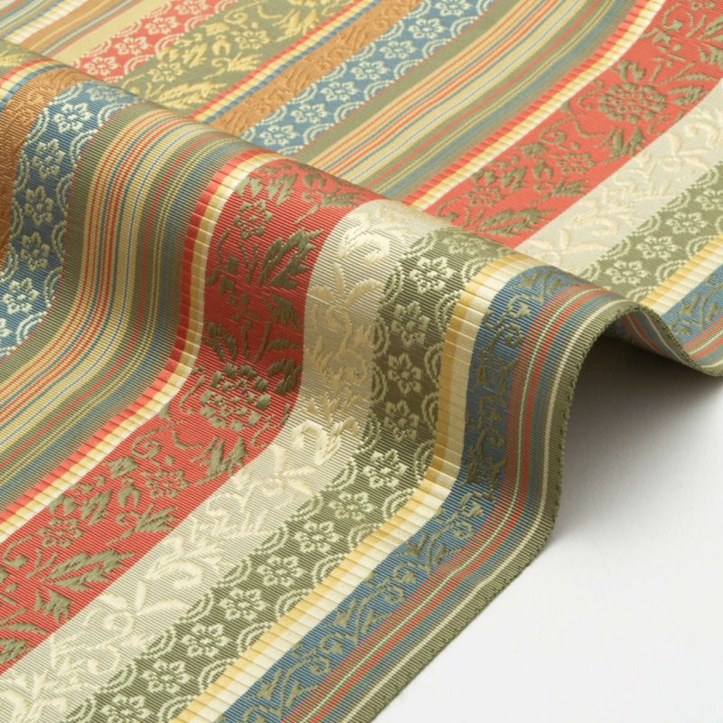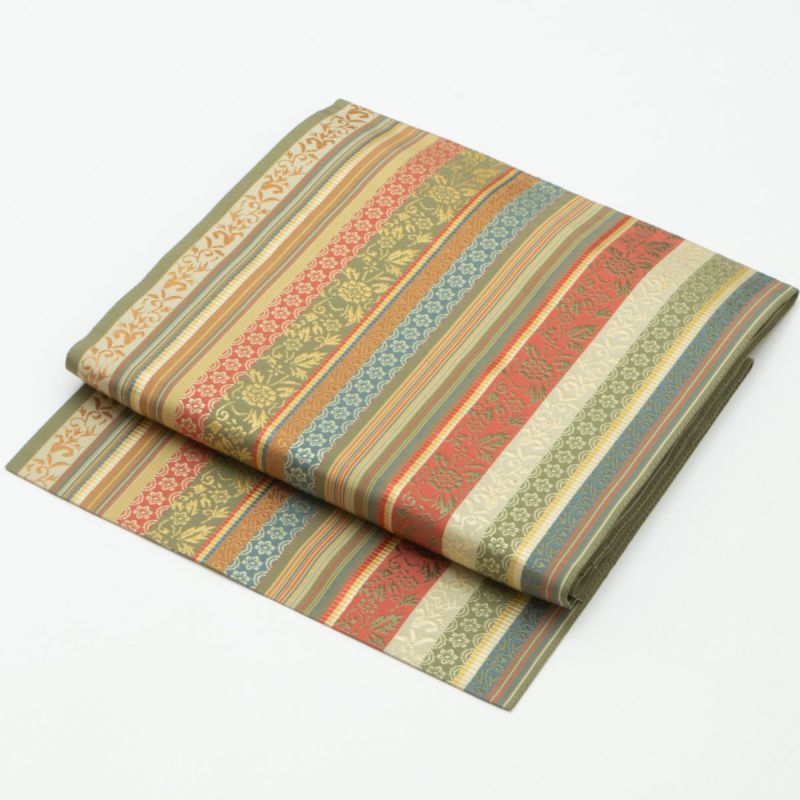 格調高い献上柄をベースに、黄緑・青緑・赤・山吹色などの華やかな色使いと繊細な織柄が交錯し、帯全体にリズムと華やぎをもたらします。