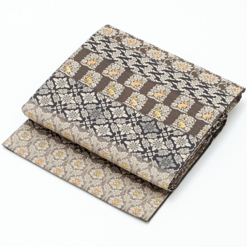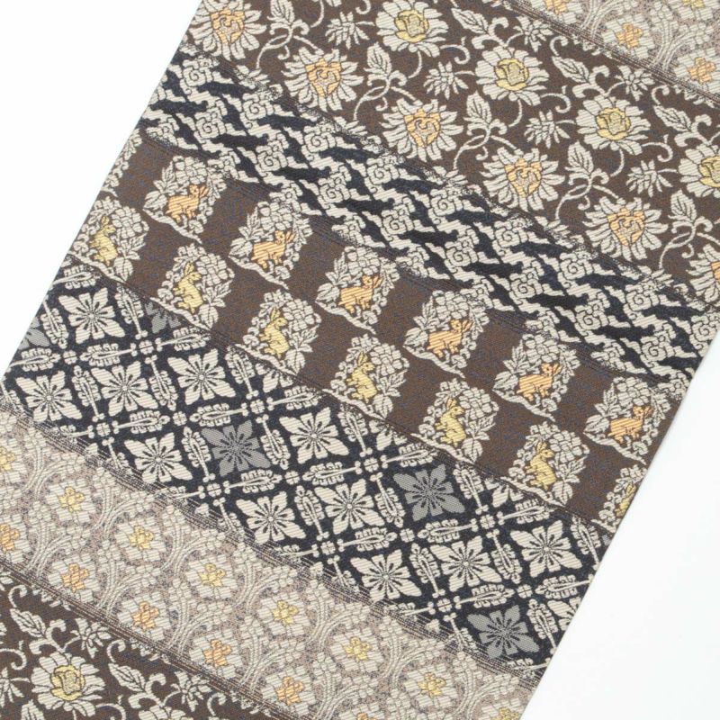 【美品】京袋帯 名物裂 花兎 花唐草 横段取り ブラウン 黒 金糸 西陣織 正絹です。