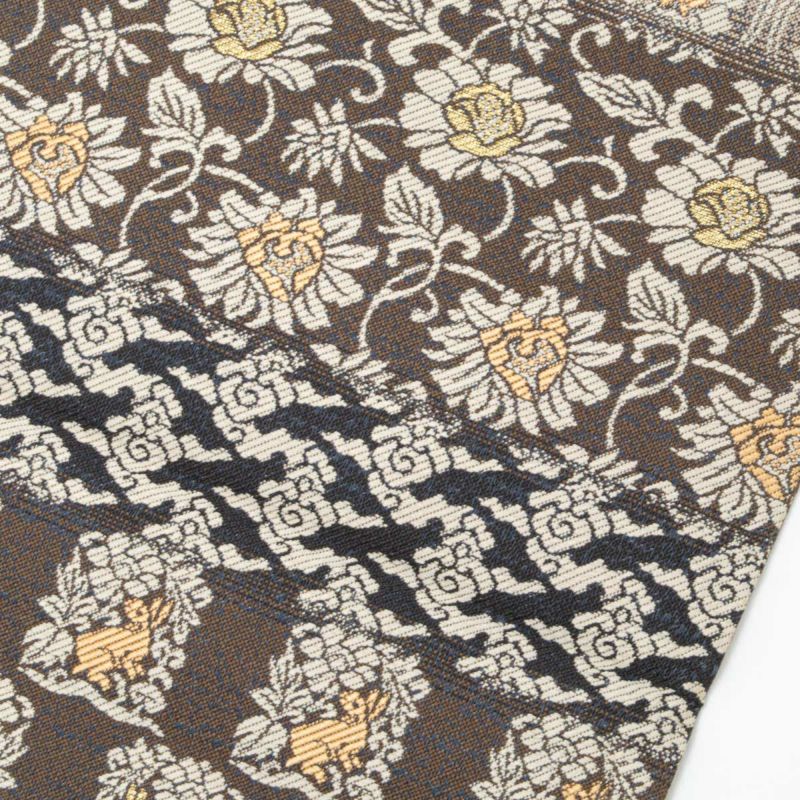 落ち着いたブラウンと黒を基調に、金糸を織り込んだ上品な名物裂文様が施された京袋帯です。
