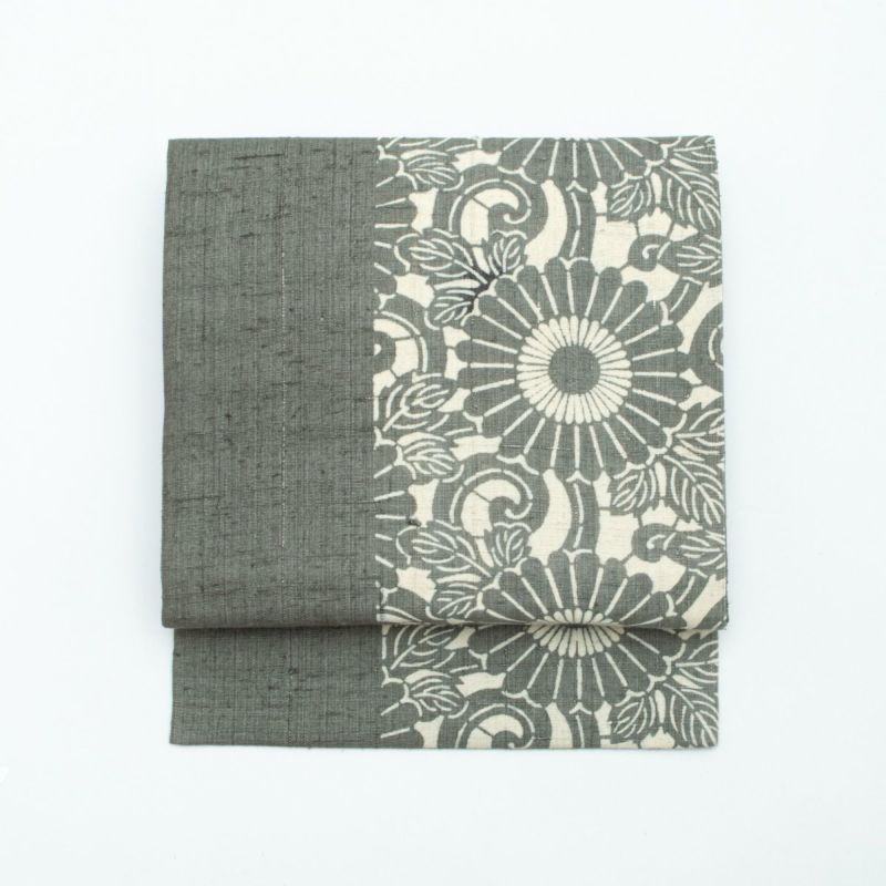 落ち着いたグレーの真綿紬地に、型絵染めによる菊唐草文があしらわれた、上質な名古屋帯です。