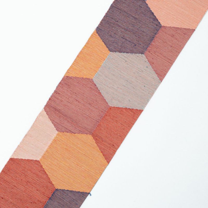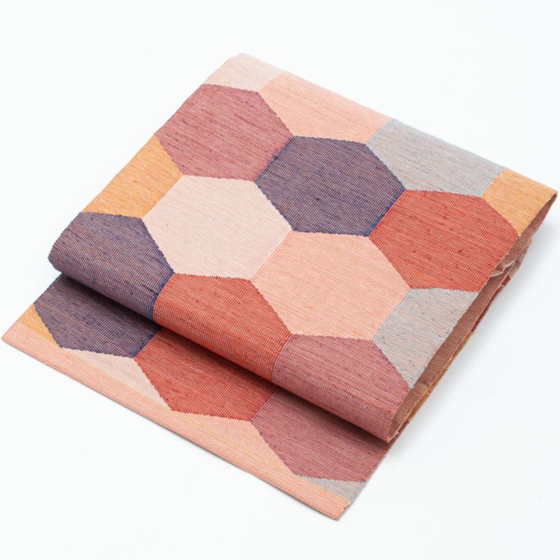 幾何学文様の中でも人気の高い「亀甲繋ぎ」を、モダンでカラフルな配色で織り上げた名古屋帯です。