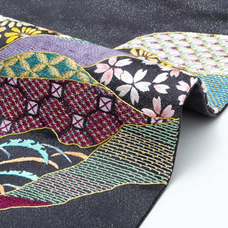 中国三大刺繍のひとつ、蘇州刺繍による繊細な針仕事が帯全体を品よく引き立てています。