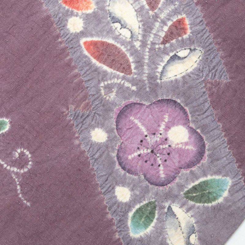 オレンジ・水色・緑などの差し色が、落ち着いた紫地の中でさりげなく華やぎを添え、コーディネートを品よくまとめてくれます。
