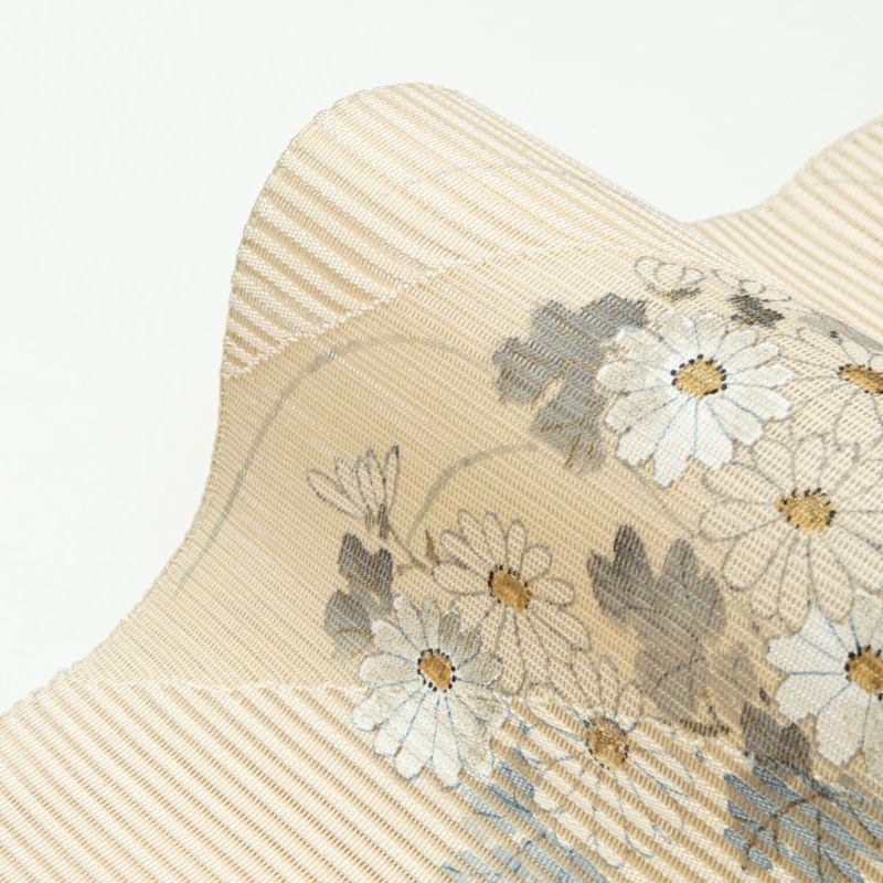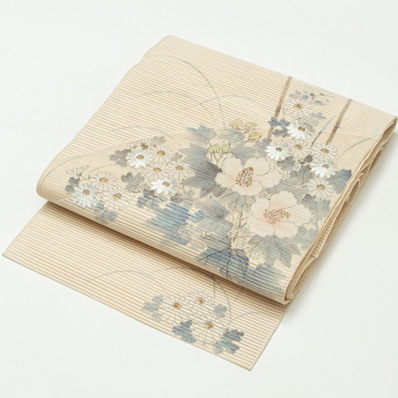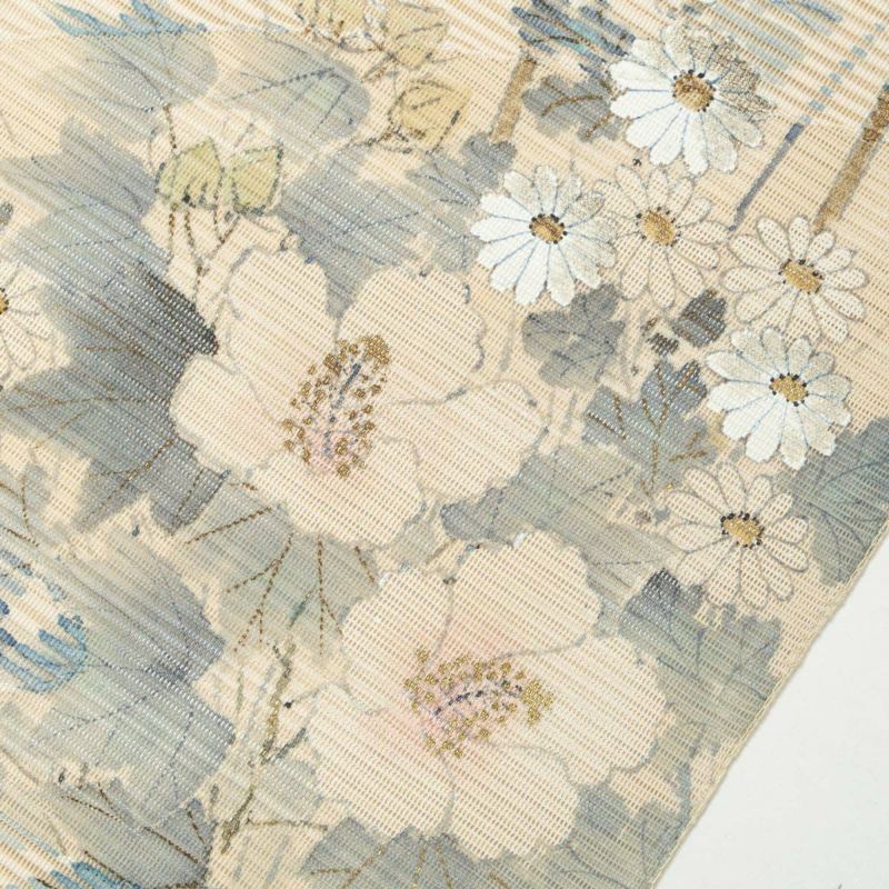 淡いライトベージュ地に、芙蓉と菊の花々が繊細に描かれた開き名古屋帯です。