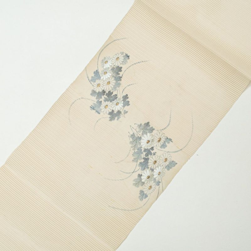 開き名古屋帯 絽 手描き 芙蓉と菊 ライトベージュ 正絹 八寸です。