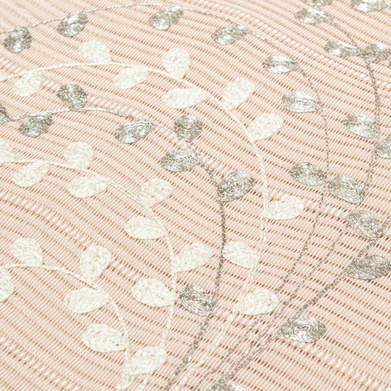 やわらかな薄桜色の地に、白と銀糸を用いた刺繍で、優美な植物文様がモダンに表現されています。