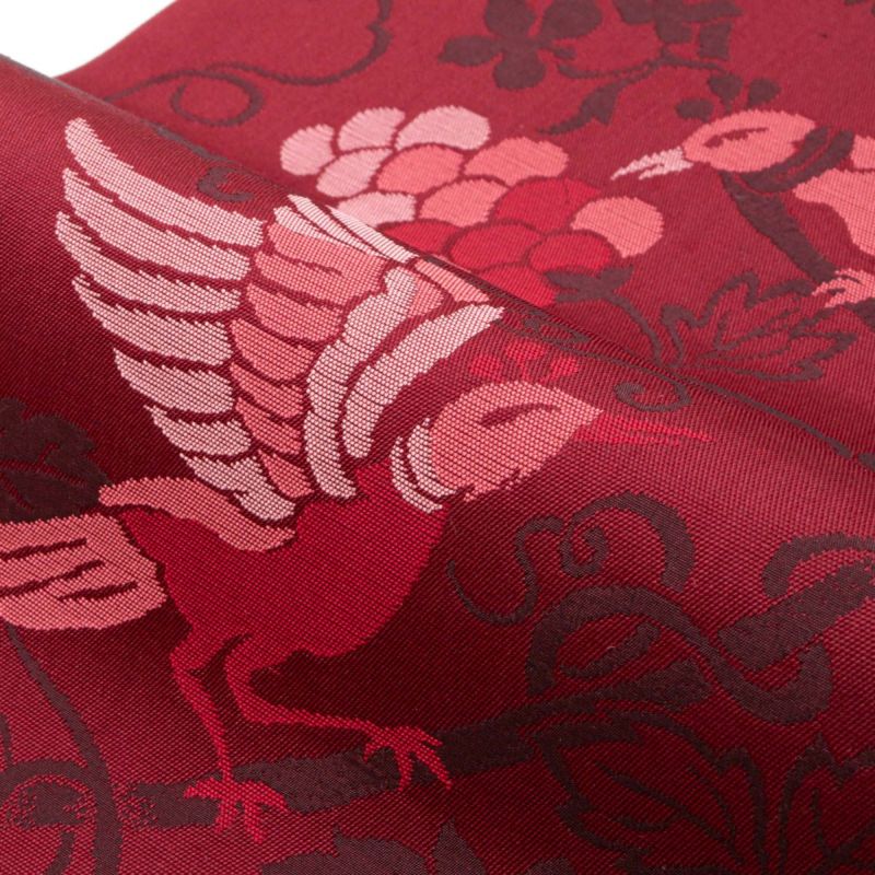 深みのある葡萄色を地に、唐草の蔓が全体に伸び、ところどころに瑞鳥(ずいちょう)が葡萄の実に戯れる姿が描かれています。文様は織りによって表現され、色数を抑えながらも濃淡で立体感を演出しています。
