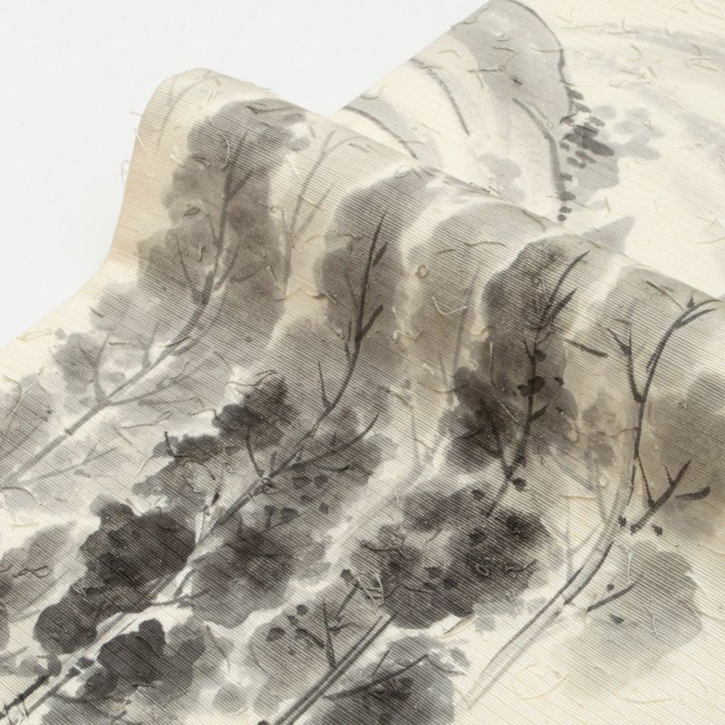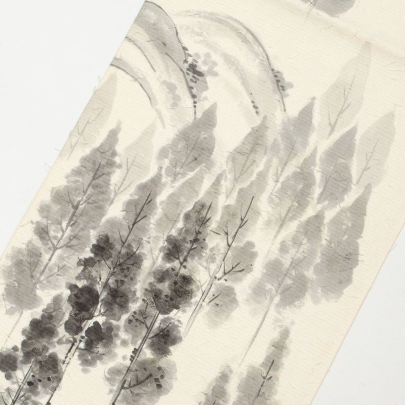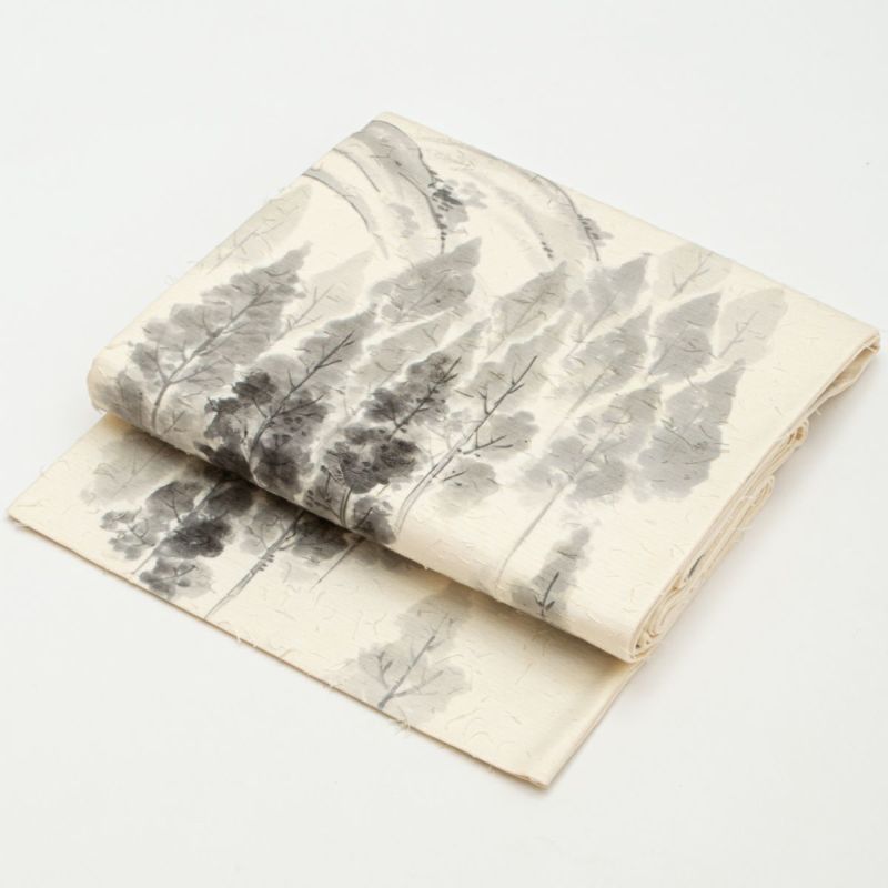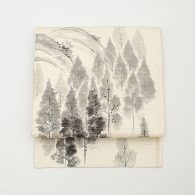 繊細なオフホワイトのひげ紬地に、淡墨への暈しが美しく、静寂な森の気配が帯全体に広がります。