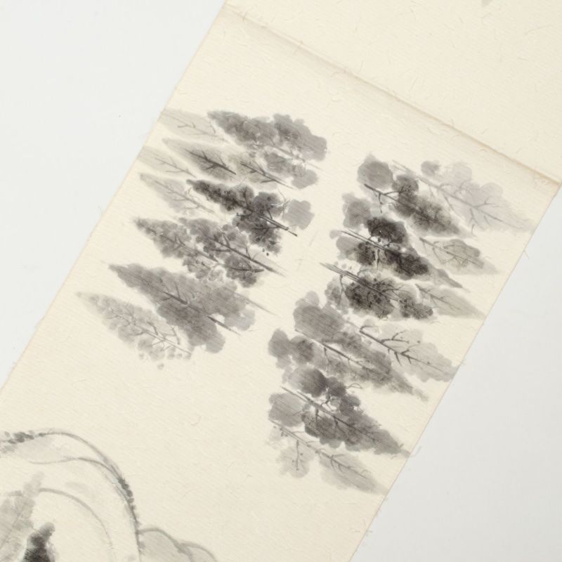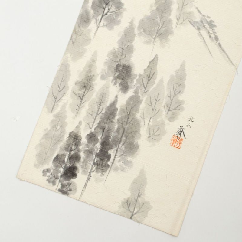 墨の濃淡によって表現された静謐な北山杉の姿は、奥行きと静けさを感じさせ、まるで一幅の水墨画のよう。