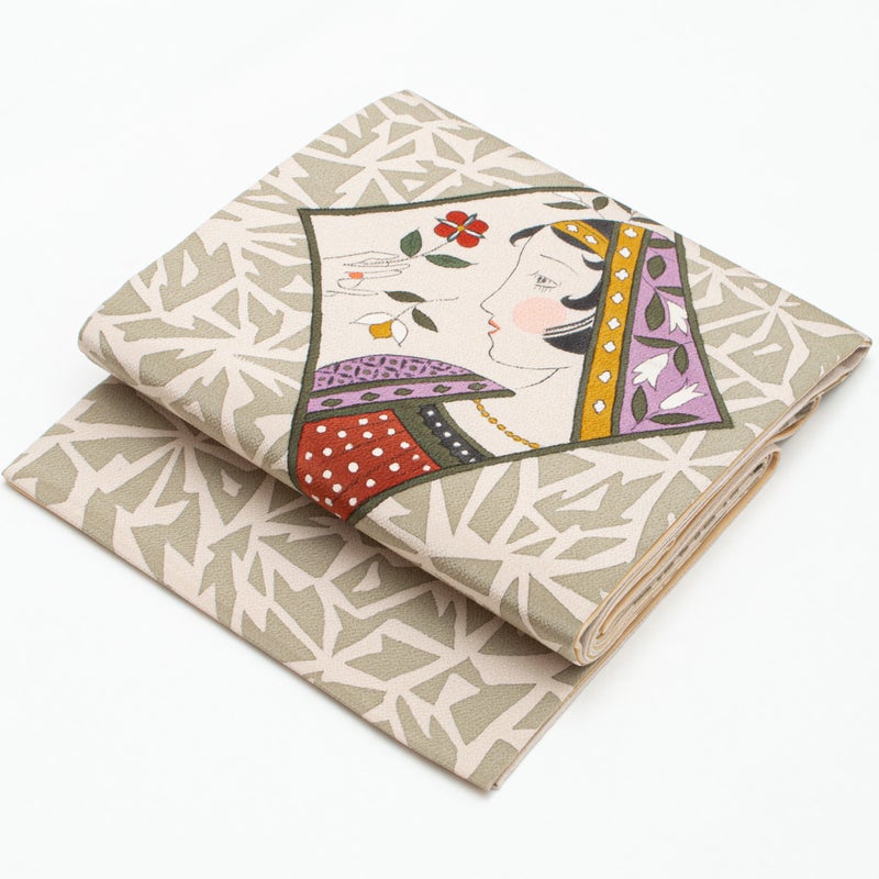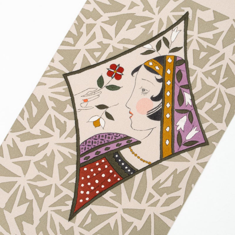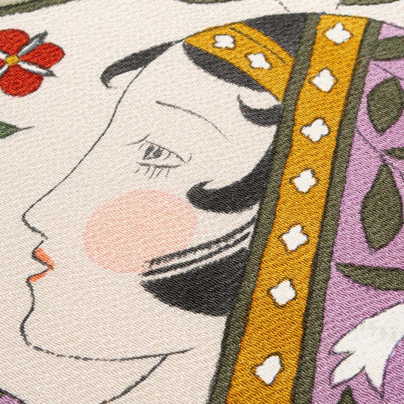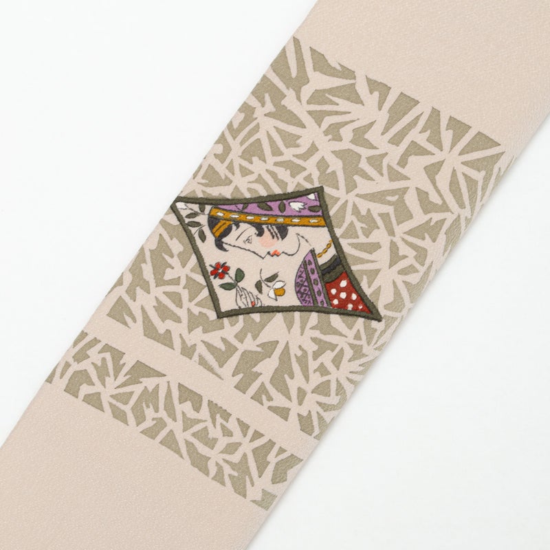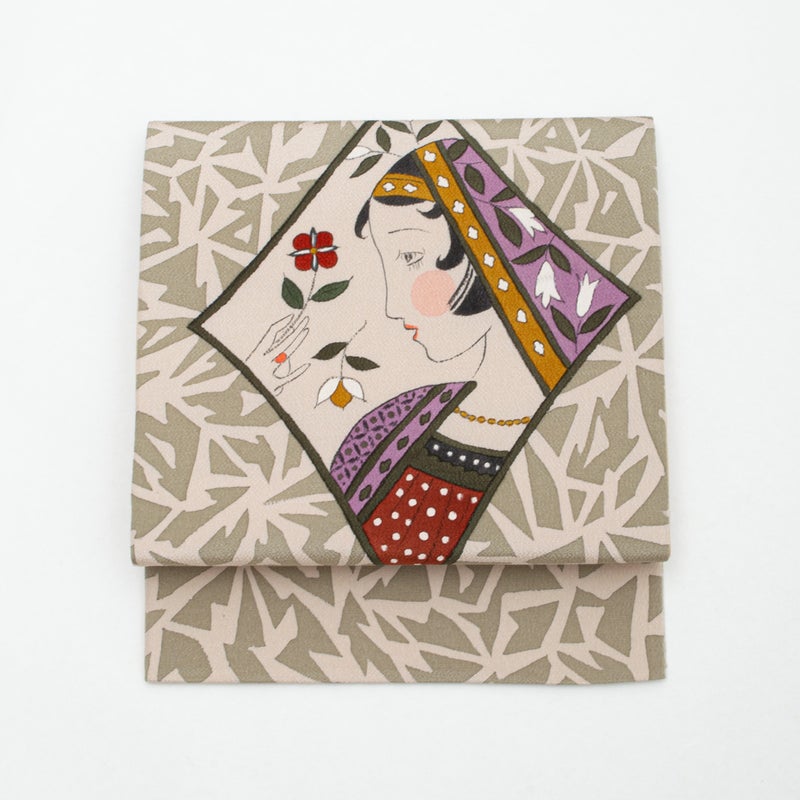 竹久夢二を思わせるような画風の美人画が染め成された、ベージュ地の洒落袋帯です。