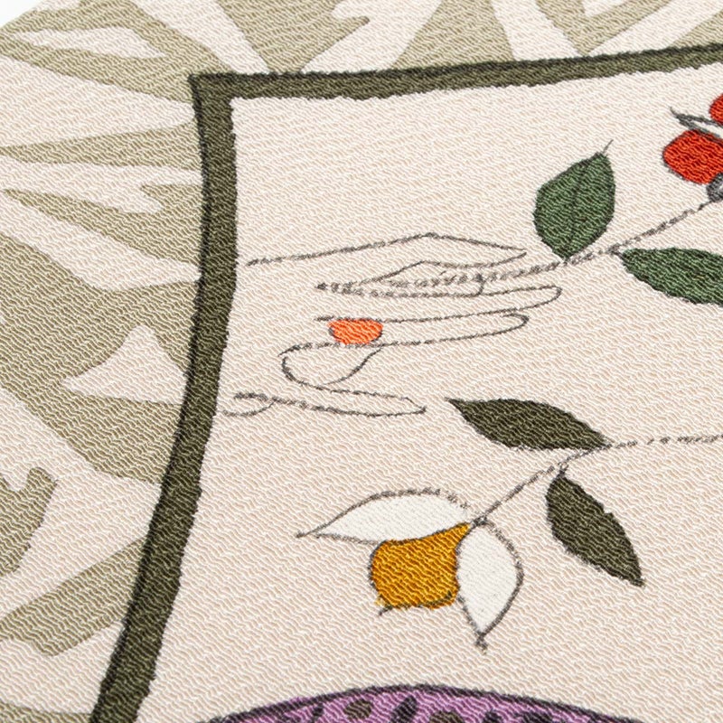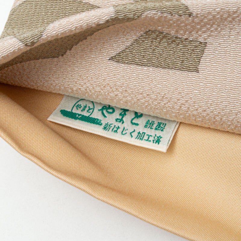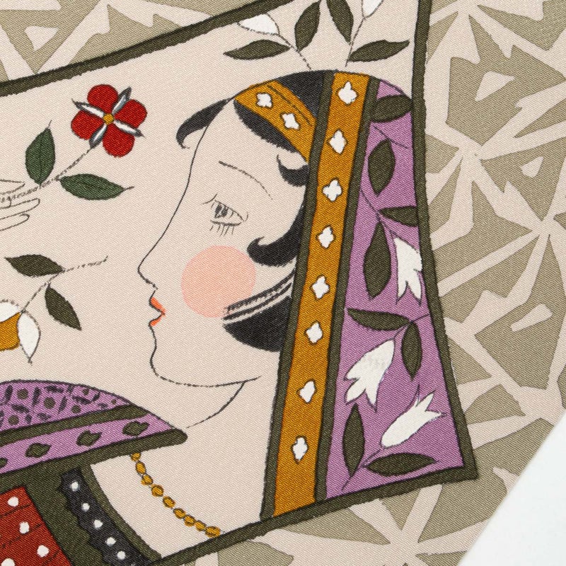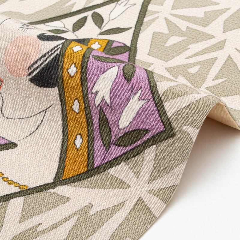 地には抽象的な葉のような模様が広がり、やわらかな色合いの中に人物図が映える、やまと誂品の一本です。