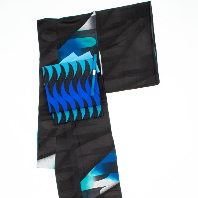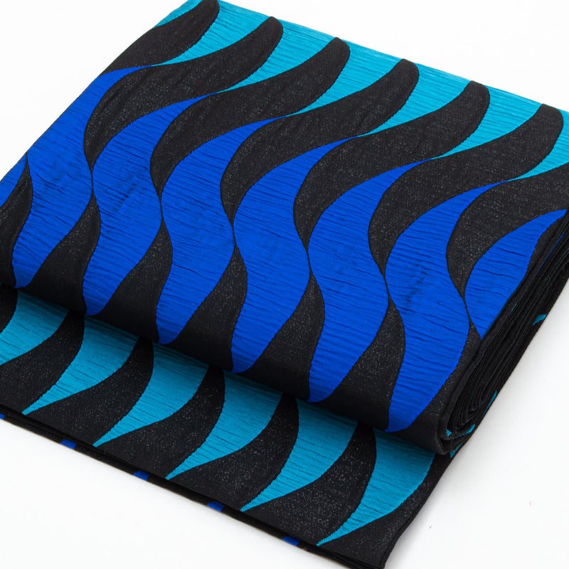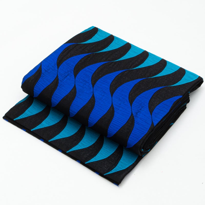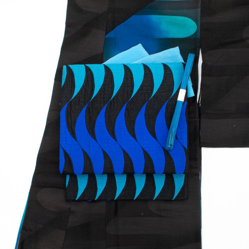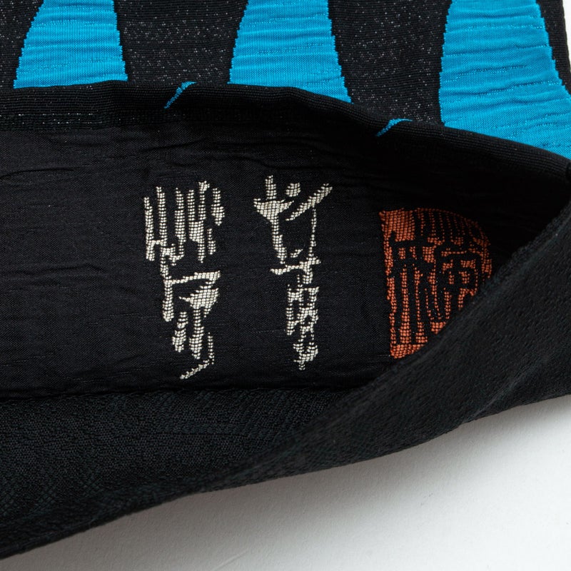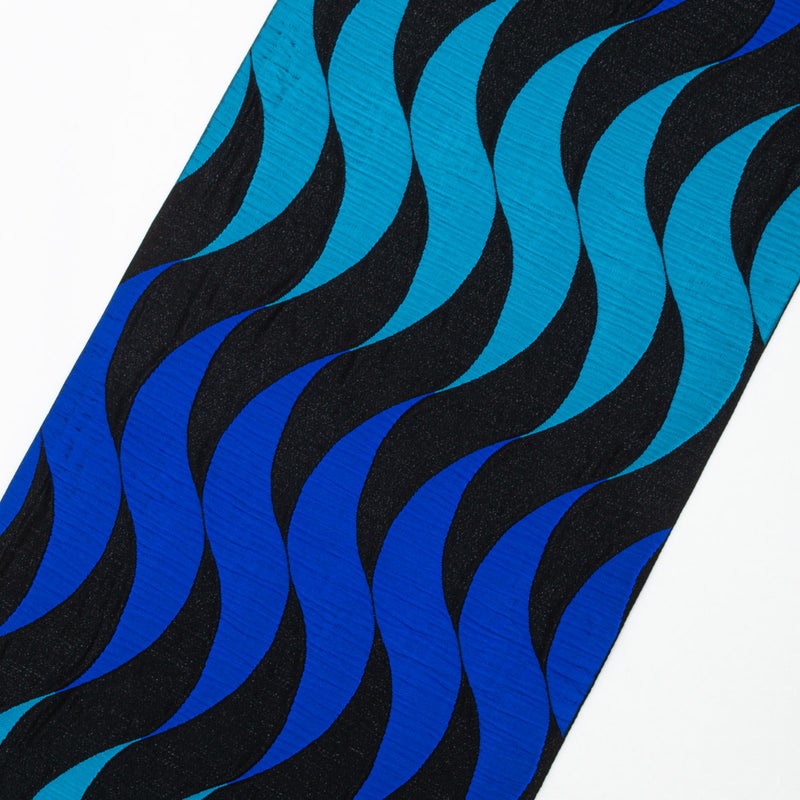 黒地に、青と青緑のゆらぐ曲線が連続して織り出された洒落袋帯です。