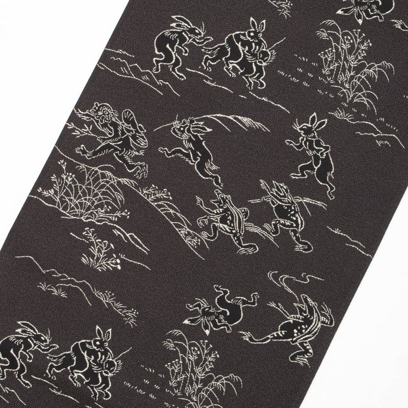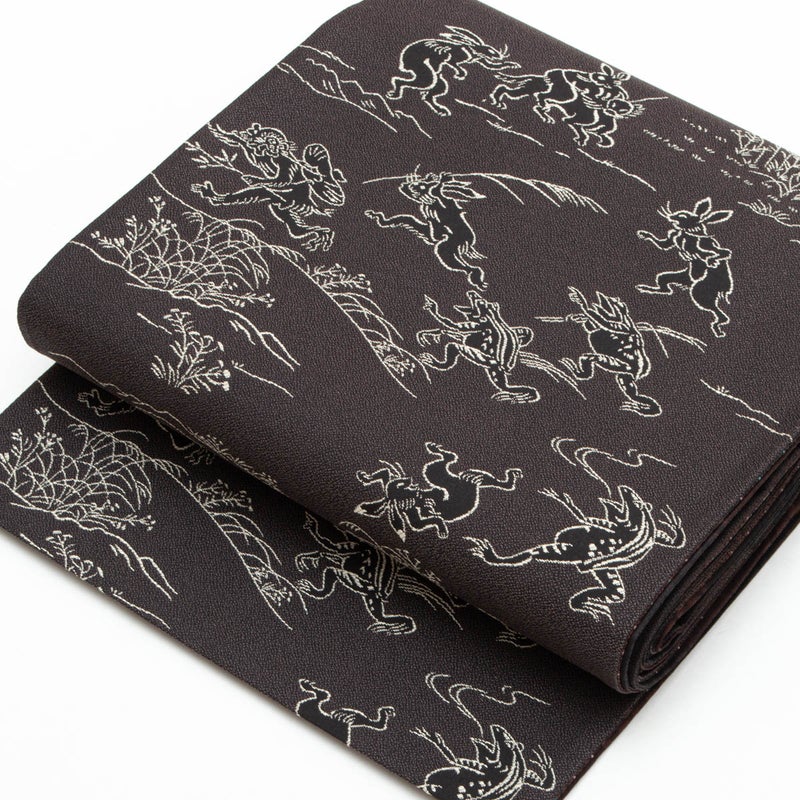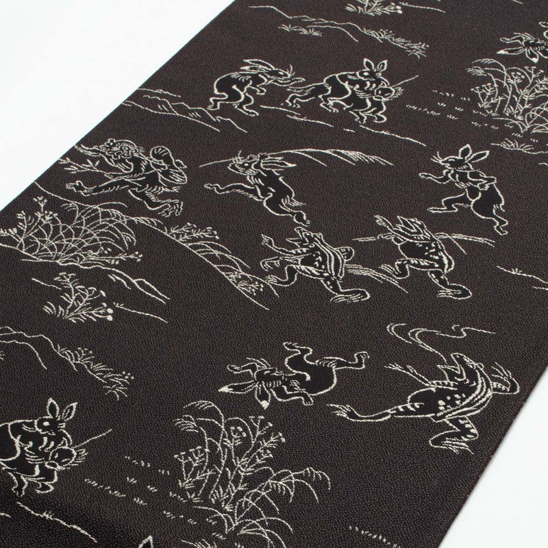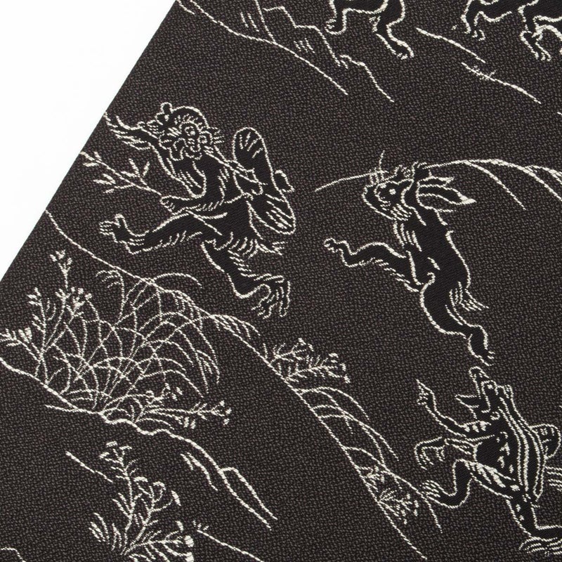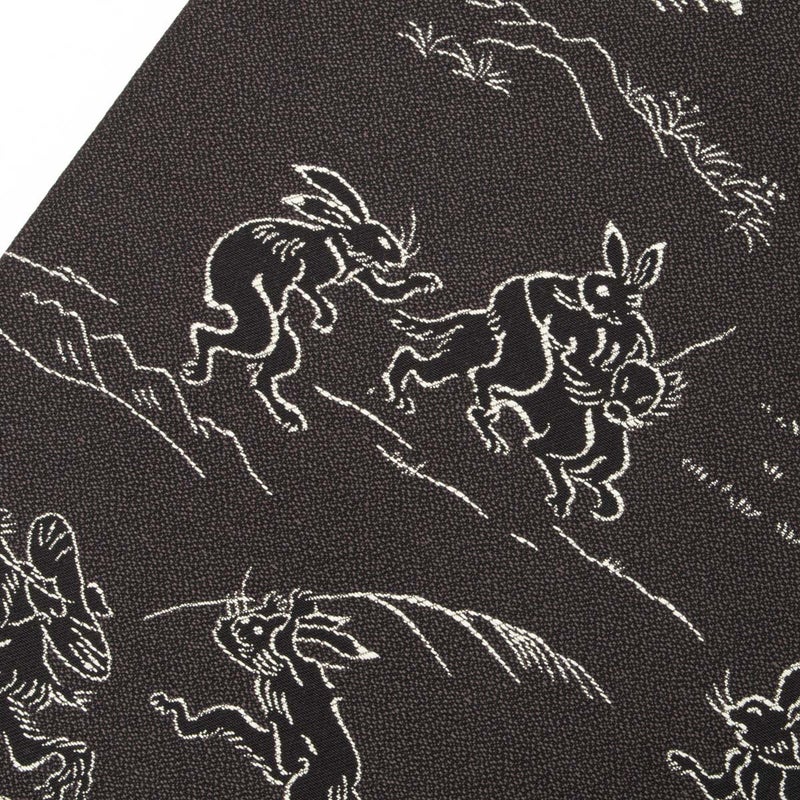 黒地に、鳥獣戯画を思わせる兎や蛙の姿が、白い線で軽やかに織り出された洒落袋帯です。