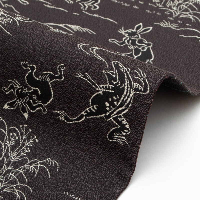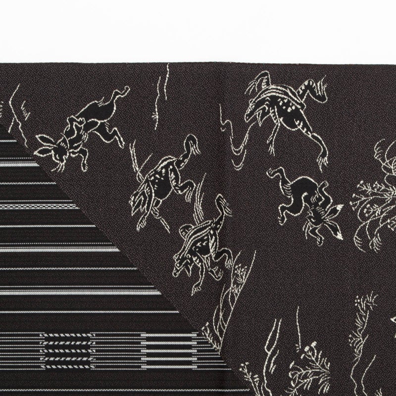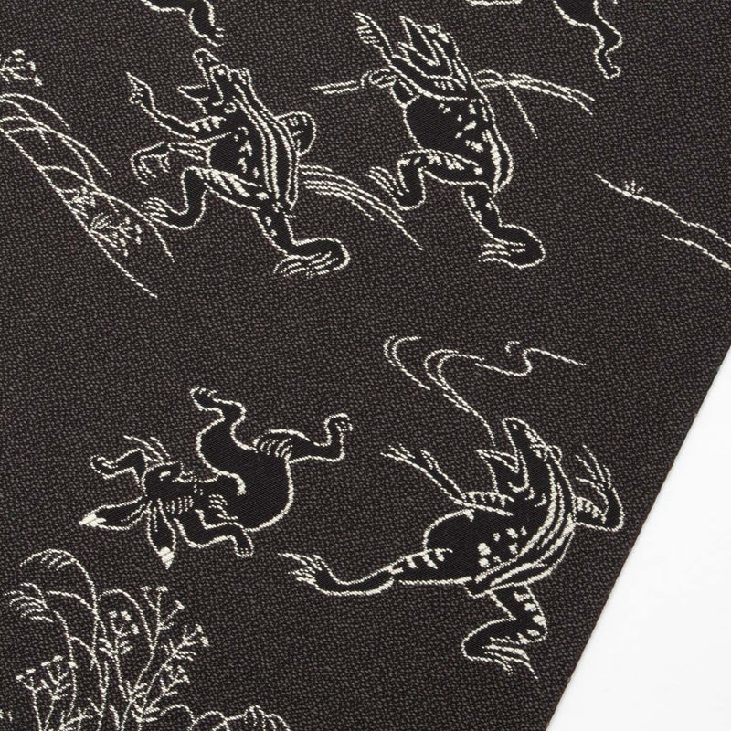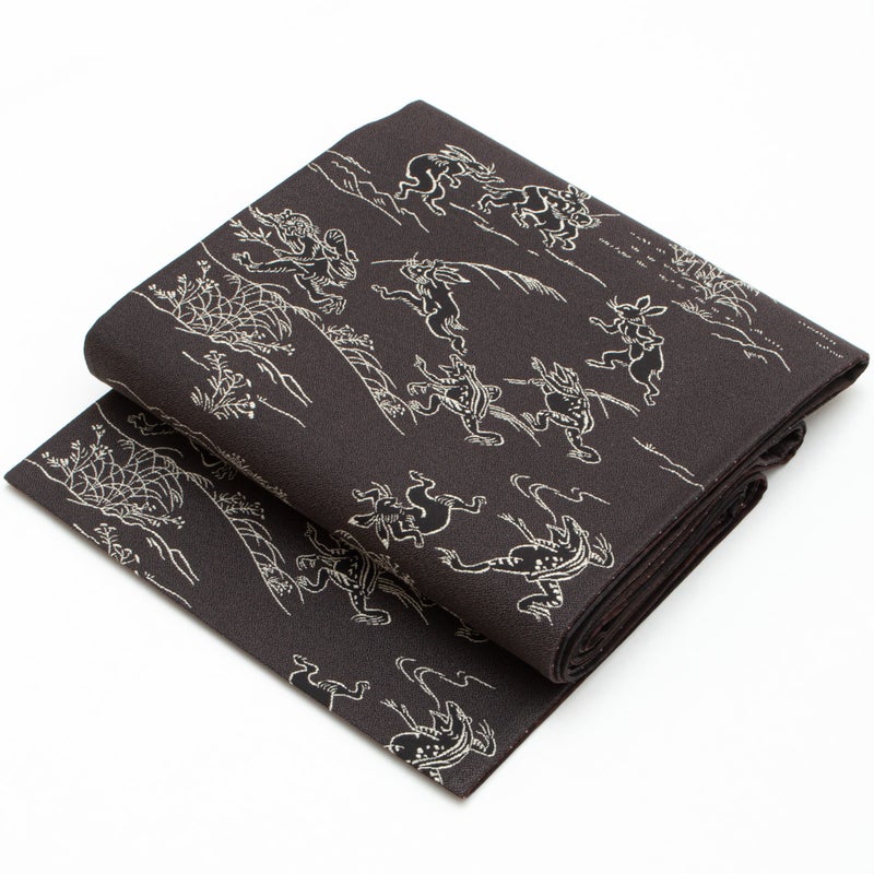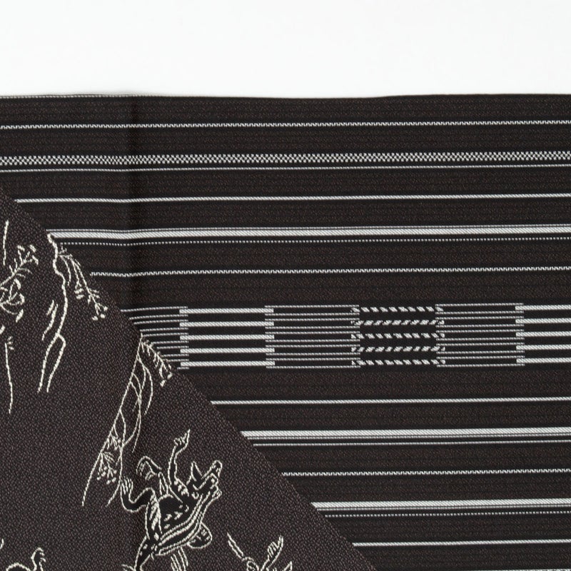 黒地に、鳥獣戯画を思わせる兎や蛙の姿が、白い線で軽やかに織り出された洒落袋帯です。
