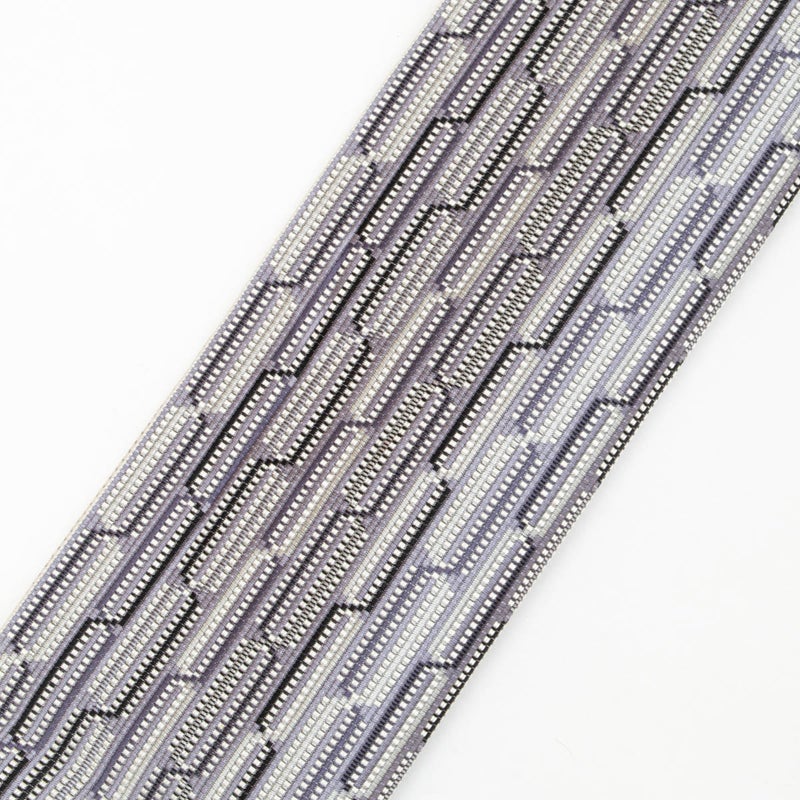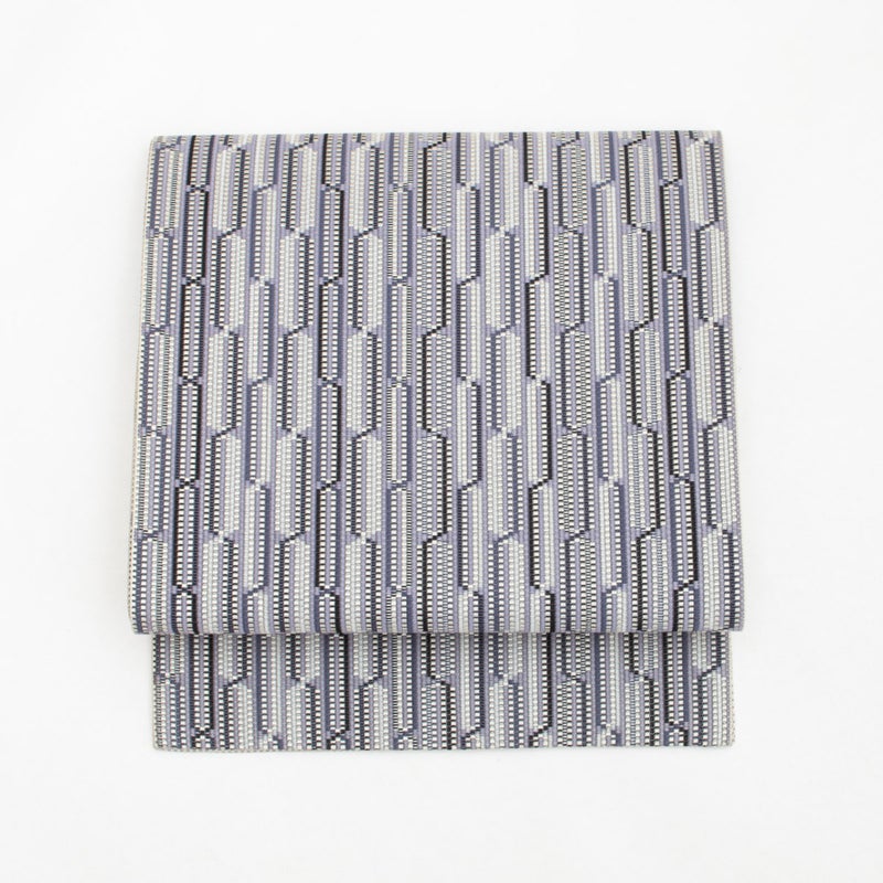 やわらかなグレーを基調に、幾何学文様を織り出した洒落袋帯です。